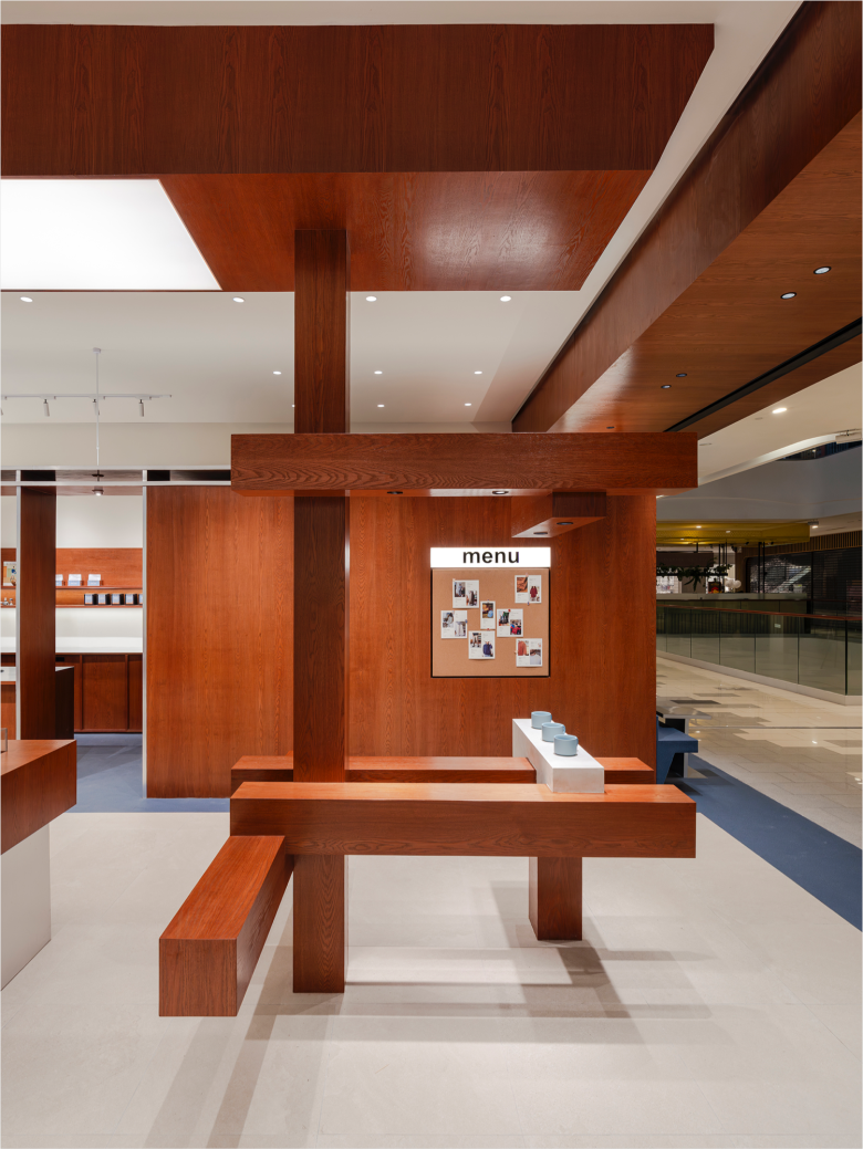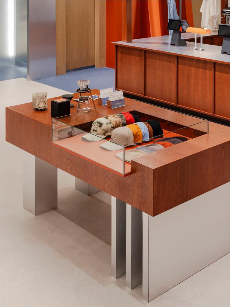 Mind you, the imagery and graphics are displayed like daily specials, presented against rich cherry wood textures that lend a sense of warmth and sophistication throughout the store. Taking centre stage in the elongated space is a totemic, floor-to-ceiling wooden structure that functions as a product display, followed by a pastry display-inspired table brimming with accessories. On one side of the store, a built-in café cabinet with legs are inspired by the traditional stilted structure of Malay houses integrates a basin alongside a minimalist hanging rod, adding further cultural layering to the setting. Throughout the premises shoppers will come across coffee-related objects. The new ASAL store carries the brand’s full range of men’s apparel and accessories. © superfuture