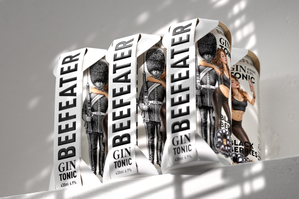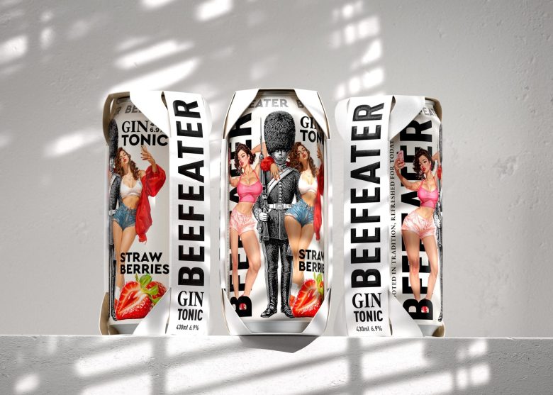 Beefeater Gin & Tonic’s packaging strikes a bold balance between heritage and modern flair. The iconic London guard illustration anchors the design in tradition, while playful pin-up style characters and vibrant fruit graphics inject energy and contemporary appeal. Large, confident typography reinforces brand strength, creating a striking contrast against the clean white background.