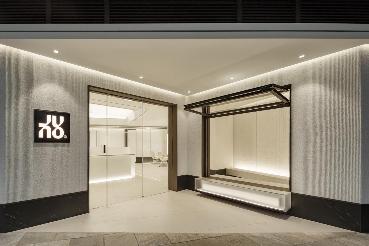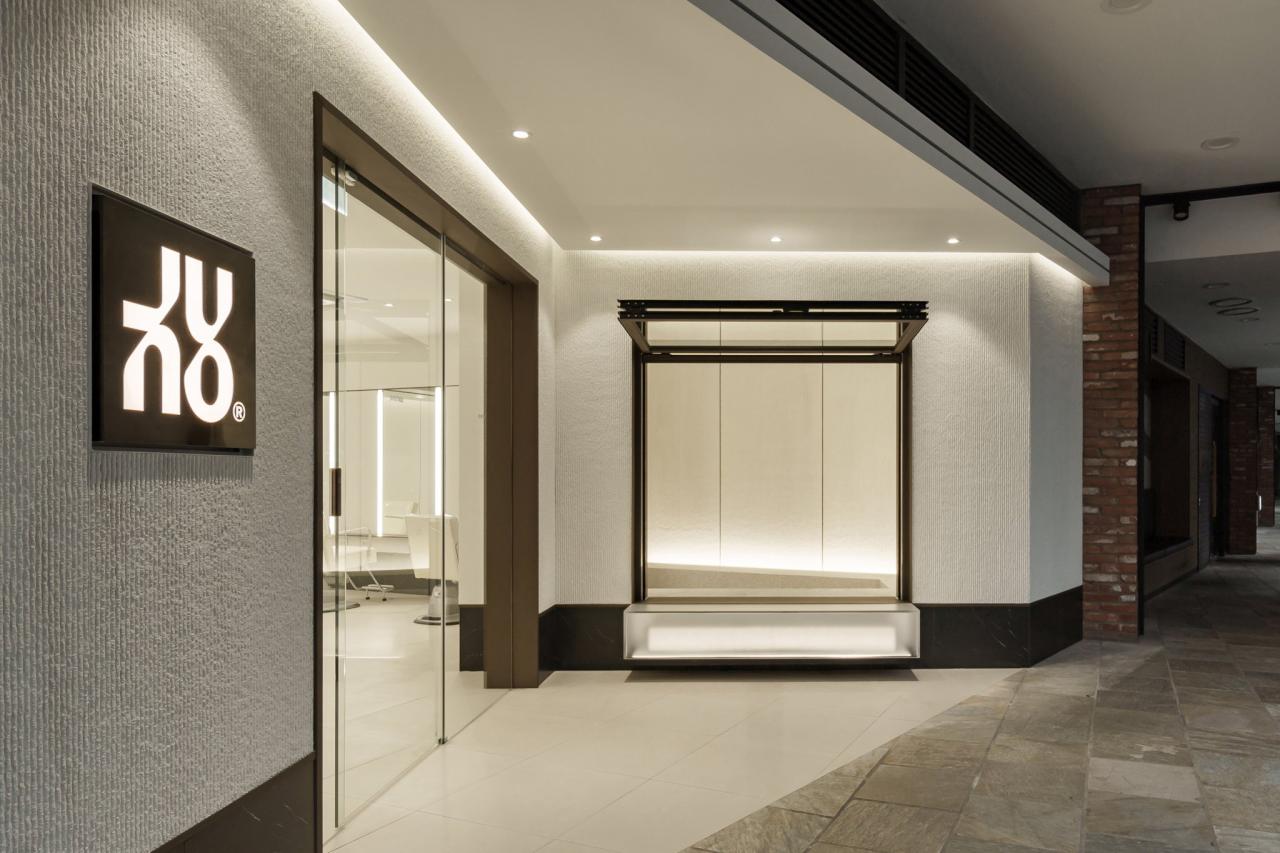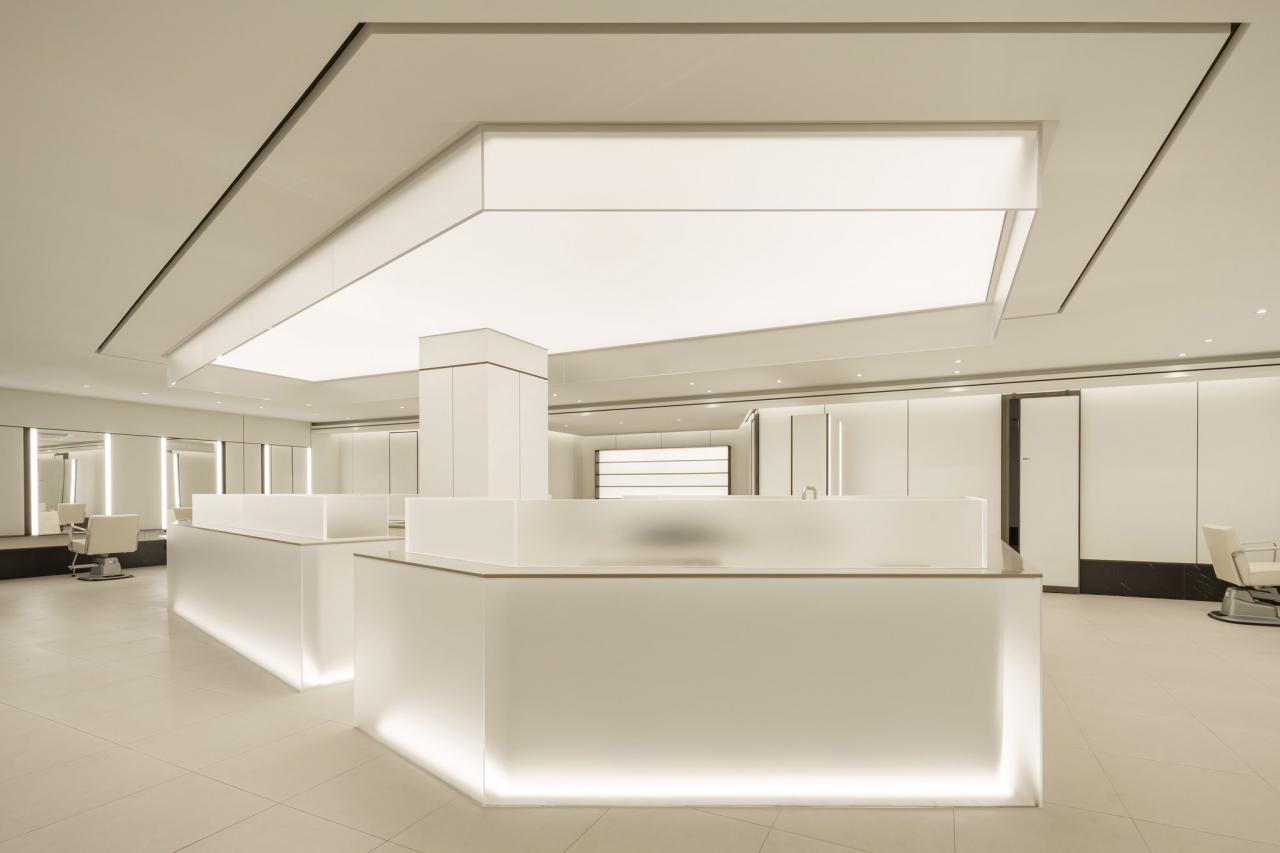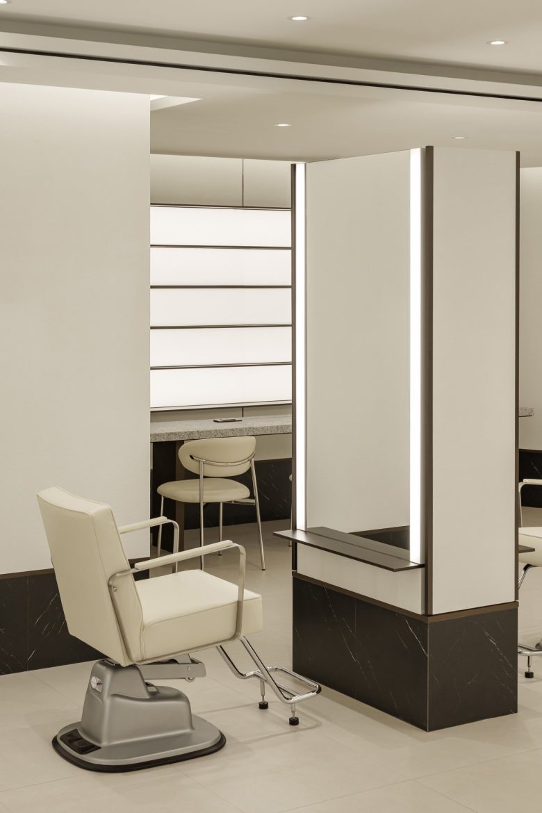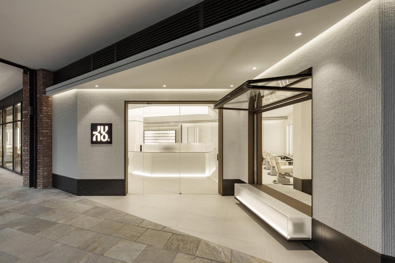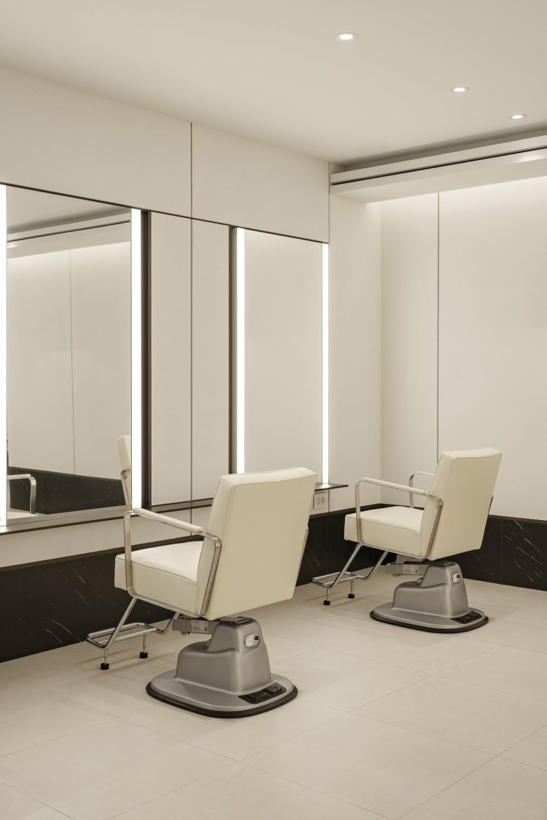 Juno Hair, one of Korea’s leading hair salon brands, is located inside a multi-complex shopping mall. Pangyo is home to many IT companies, and much of the city carries an image associated with digital and technological industries. In this context, the Juno Hair brand aimed to convey relaxation, comfort, and tranquility—values that contrast with digital elements. The salon is located at the end of an alley within the mall, and because its entrance is always in shade, it required a strategy to attract the attention of customers. Inside, the salon features large south-facing windows that allow natural light to flood deep into the space. However, in a hair salon—where color is crucial—it was necessary to block excessive sunlight. To address this, we placed functional rooms along the south-facing windows to block natural light from entering the main space, and instead installed a central lighting box that allowed us to control light artificially. Through this lighting box, the salon could be spotted from a distance, while also maintaining consistent illumination at all times. The entrance of the salon was pushed back from its original boundary to create room for a bench, and folding windows were installed at the front so that, on pleasant days, the interior and exterior could be connected and interact. This design created a more open and leisurely entrance, functioning as a transitional space.