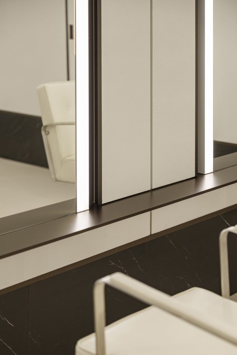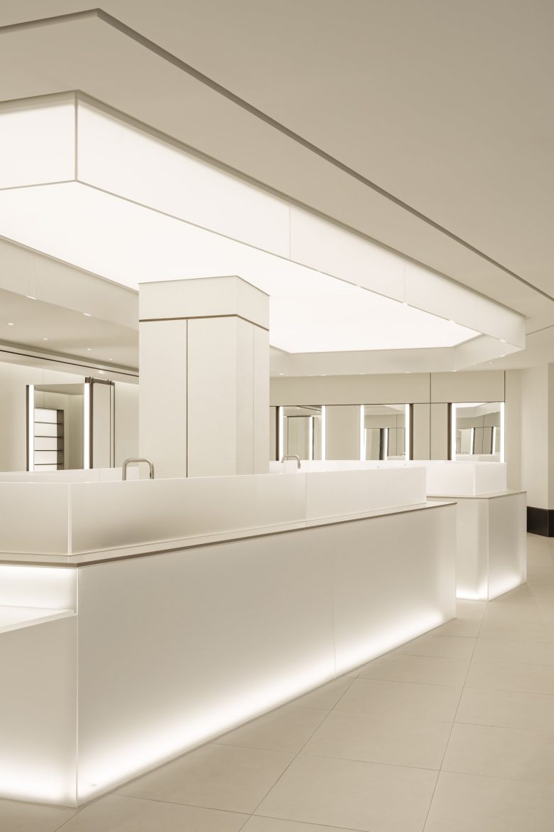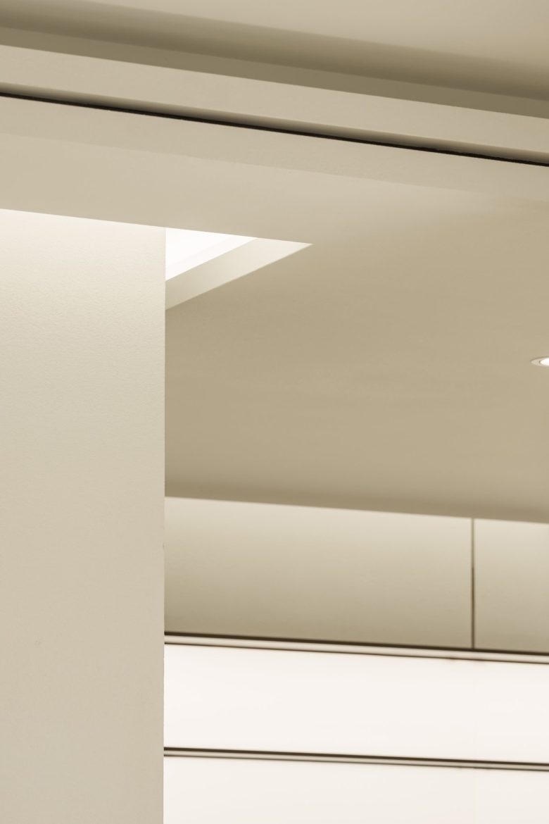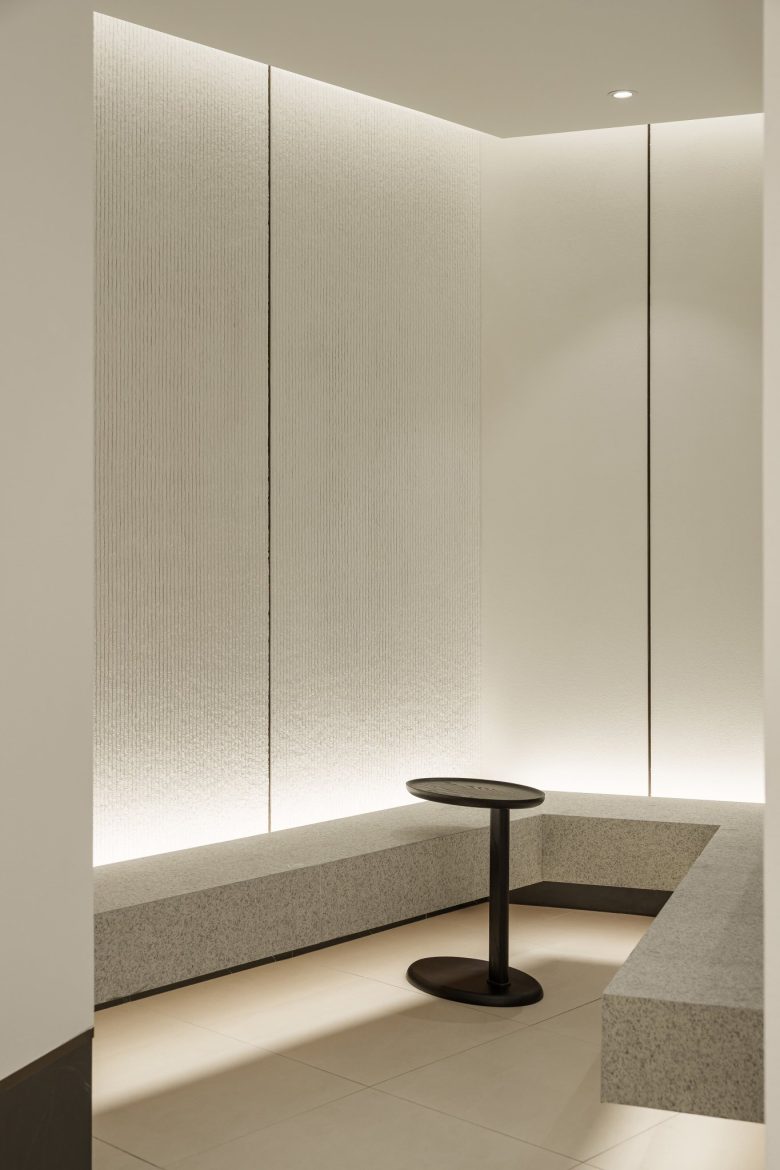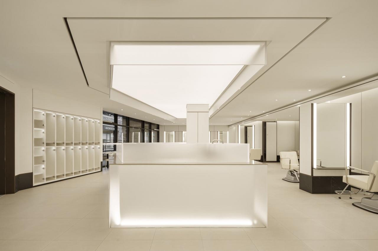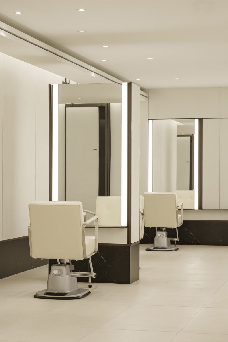 Juno Hair, one of Korea’s leading hair salon brands, is located inside a multi-complex shopping mall. Pangyo is home to many IT companies, and much of the city carries an image associated with digital and technological industries. In this context, the Juno Hair brand aimed to convey relaxation, comfort, and tranquility—values that contrast with digital elements. The salon is located at the end of an alley within the mall, and because its entrance is always in shade, it required a strategy to attract the attention of customers. Inside, the salon features large south-facing windows that allow natural light to flood deep into the space. However, in a hair salon—where color is crucial—it was necessary to block excessive sunlight. To address this, we placed functional rooms along the south-facing windows to block natural light from entering the main space, and instead installed a central lighting box that allowed us to control light artificially. Through this lighting box, the salon could be spotted from a distance, while also maintaining consistent illumination at all times. The entrance of the salon was pushed back from its original boundary to create room for a bench, and folding windows were installed at the front so that, on pleasant days, the interior and exterior could be connected and interact. This design created a more open and leisurely entrance, functioning as a transitional space.