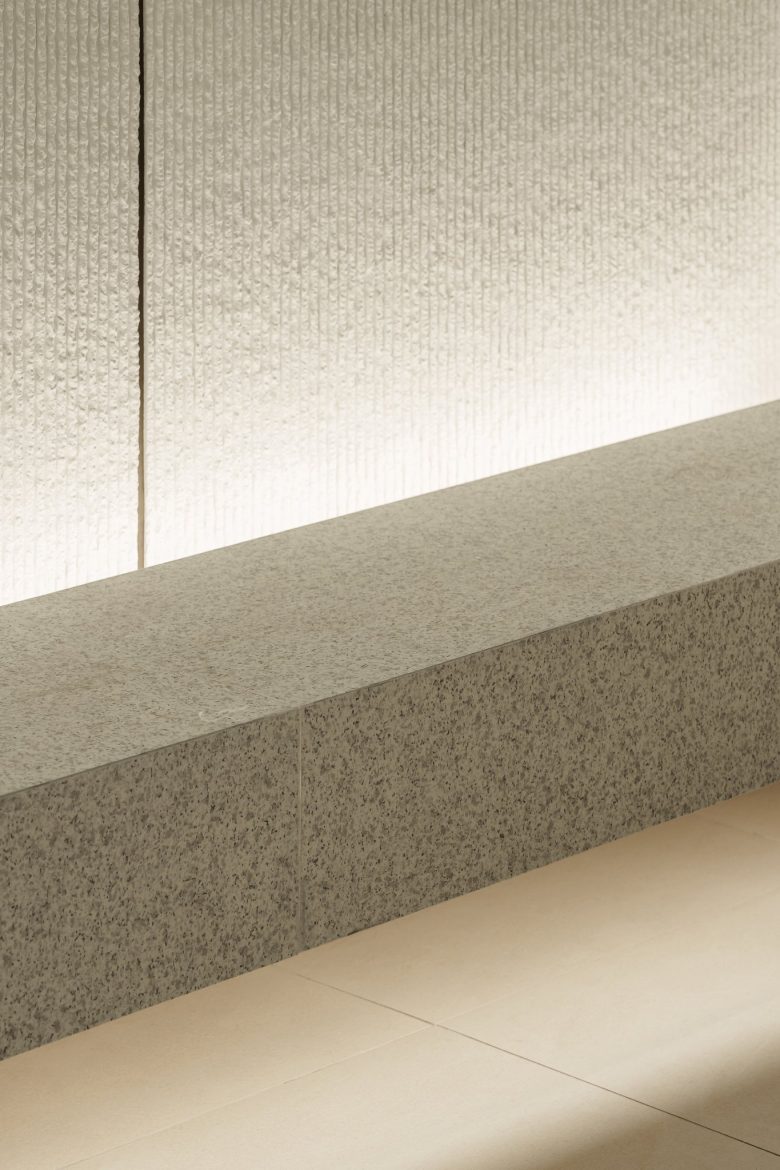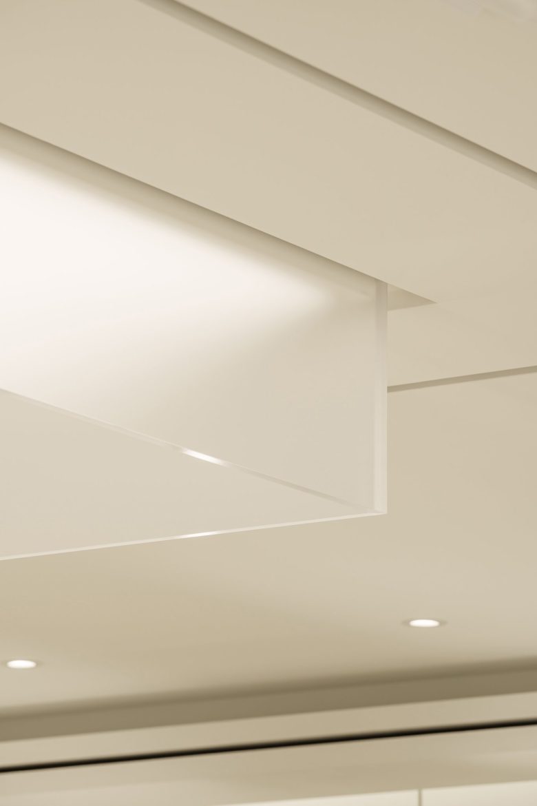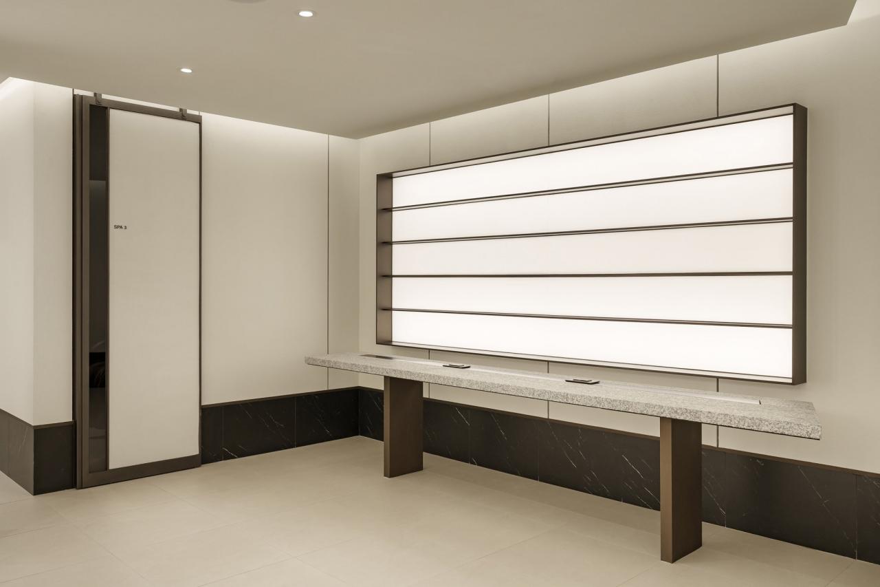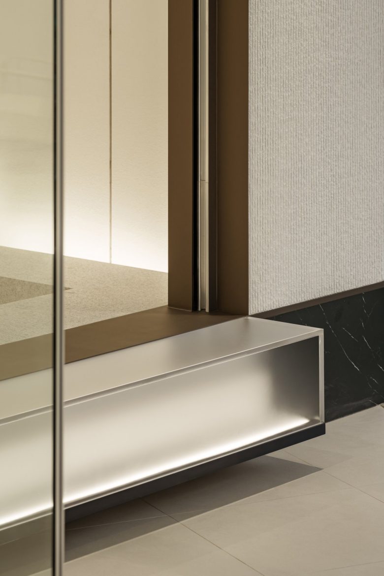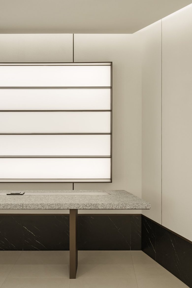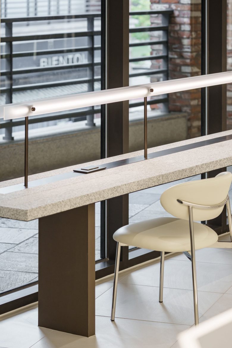 Juno Hair, one of Korea’s leading hair salon brands, is located inside a multi-complex shopping mall. Pangyo is home to many IT companies, and much of the city carries an image associated with digital and technological industries. In this context, the Juno Hair brand aimed to convey relaxation, comfort, and tranquility—values that contrast with digital elements. The salon is located at the end of an alley within the mall, and because its entrance is always in shade, it required a strategy to attract the attention of customers. Inside, the salon features large south-facing windows that allow natural light to flood deep into the space. However, in a hair salon—where color is crucial—it was necessary to block excessive sunlight. To address this, we placed functional rooms along the south-facing windows to block natural light from entering the main space, and instead installed a central lighting box that allowed us to control light artificially. Through this lighting box, the salon could be spotted from a distance, while also maintaining consistent illumination at all times. The entrance of the salon was pushed back from its original boundary to create room for a bench, and folding windows were installed at the front so that, on pleasant days, the interior and exterior could be connected and interact. This design created a more open and leisurely entrance, functioning as a transitional space.