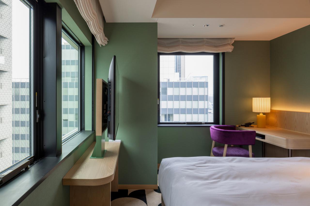 Given the compact floor area of each guest room, the design maximizes the role of windows in shaping the spatial experience. Large openings draw daylight deep into the rooms and frame dynamic views of Ginza, offering guests a strong connection to the surrounding cityscape. Recognizing that street noise diminishes at higher levels, the window-to-wall ratio gradually increases on the upper floors. This subtle gradient creates nuanced differences between rooms, ensuring that no two stays feel identical.