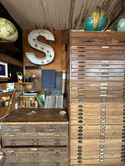 His studio feels like an extension of himself: somewhere between a treehouse and an Oxford professor’s study. Nearly everything is made of wood at least twice Oliver’s age. Antique flat-file cabinets stack waist-high on one wall and tower eight feet on the other, labeled in his signature chalky, off-kilter capitals—the same handwriting that runs across his children’s books. Globes hang from the ceiling and perch on top of the cabinets.