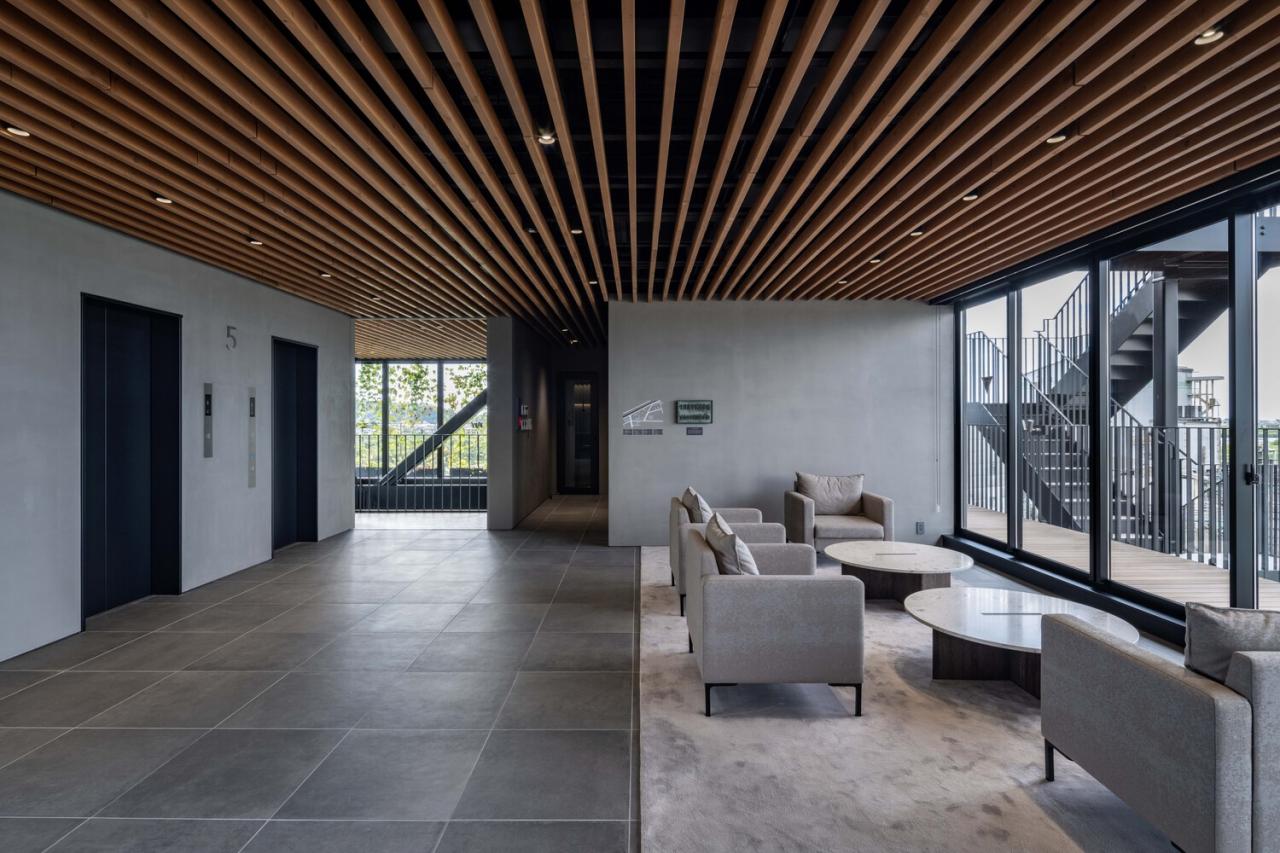 The site presented both challenges and opportunities. A private residence and a small park occupy two corners of the block. To avoid overshadowing the neighboring home and to maintain morning sunlight, the southern façade was designed as a flat plane. This decision produced an L-shaped volume that embraces the adjacent park, transforming it into part of the workplace experience. At the same time, the site lies within the Jintsu River floodplain, requiring that principal office functions be elevated above ground level for flood resilience.