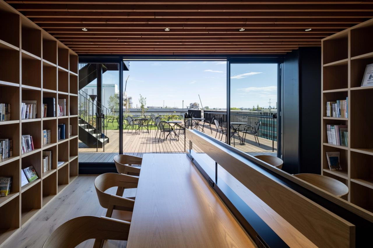 The structure is steel-framed, with a full-glass façade and wrap-around balconies that serve as both refreshment areas and environmental buffers. Pinewood louver ceilings extend seamlessly from the interior to the exterior eaves, concealing mechanical equipment while creating a warm atmosphere like being under tree cover. Their shadows recall the underside of traditional shrine roofs, and at night, deck lighting highlights the wood pattern. Louvers on the piloti ceiling evoke the hulls of kitamae trading boats.