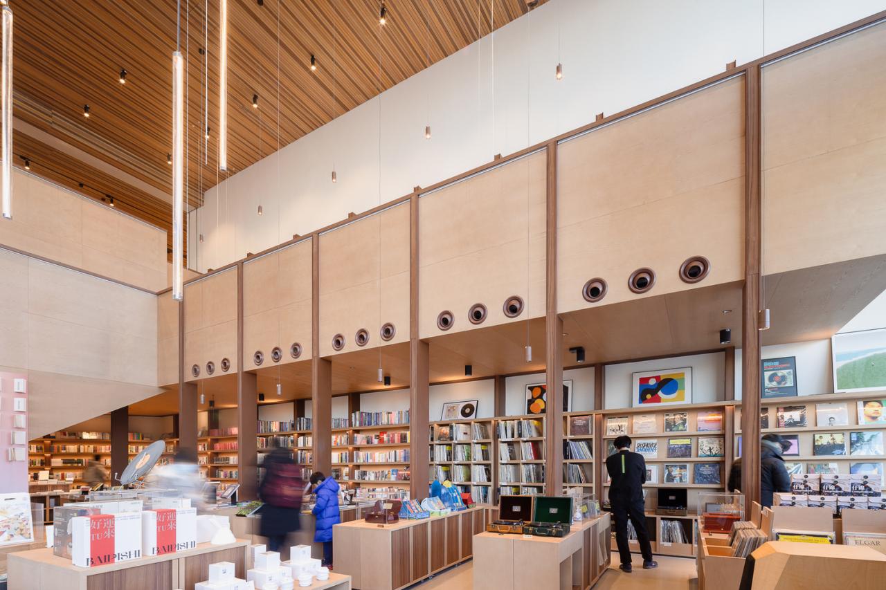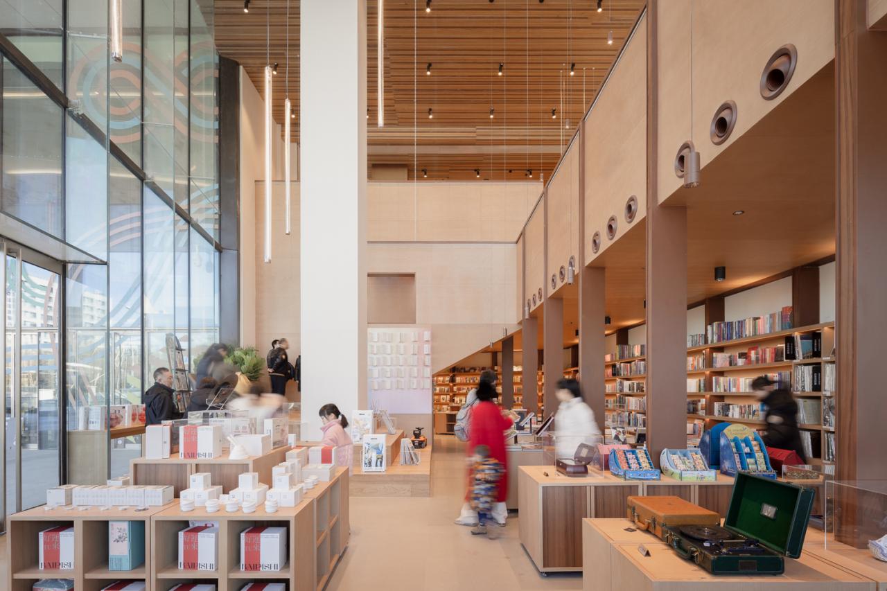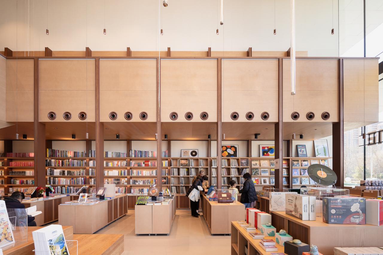 The main display wall within the store artfully reimagines the double-height space, converting it into a “vinyl concert hall” alongside cozy, human-scale zones for reading, coffee breaks, events, and children’s activities. This design not only infuses the store with a rich vinyl atmosphere but also seamlessly blends diverse content categories.