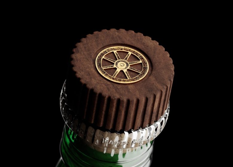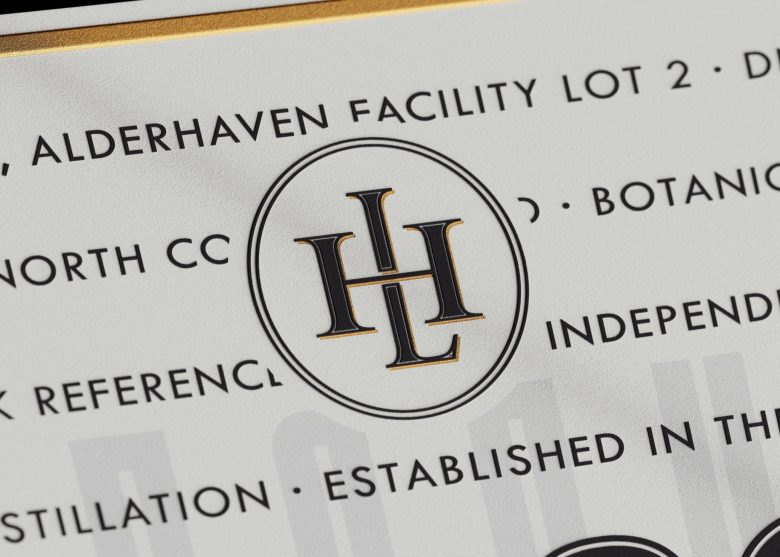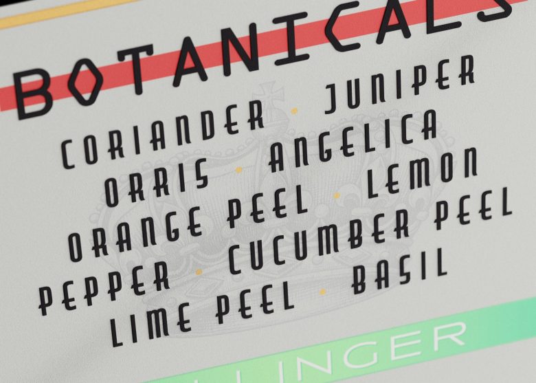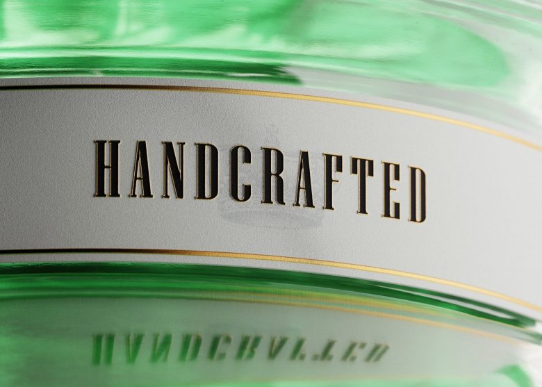 The design pairs a tall, structured glass bottle with a diagonal wrap label rich in typographic detail and subtle gold accents. Pale green tones and botanical illustrations reflect the gin’s fresh character, resulting in a contemporary yet timeless identity rooted in traditional craftsmanship.