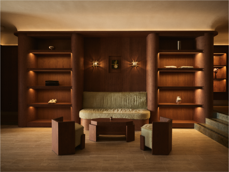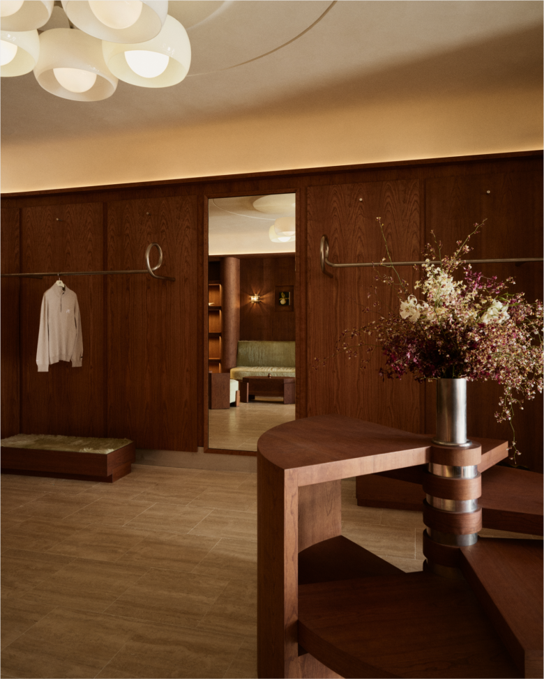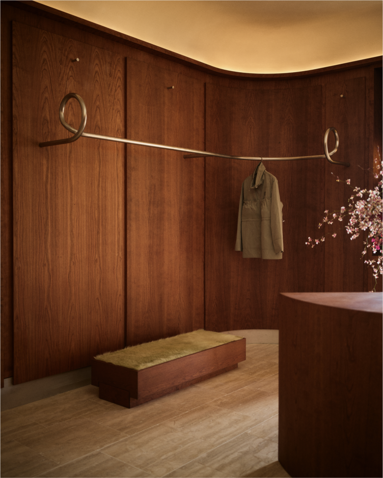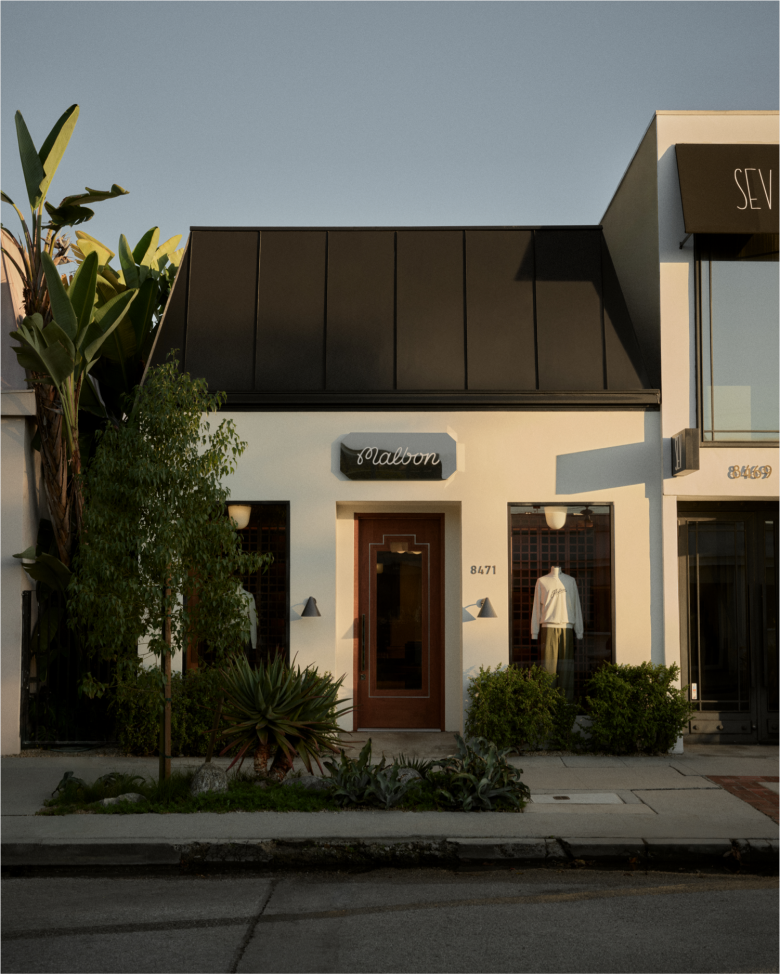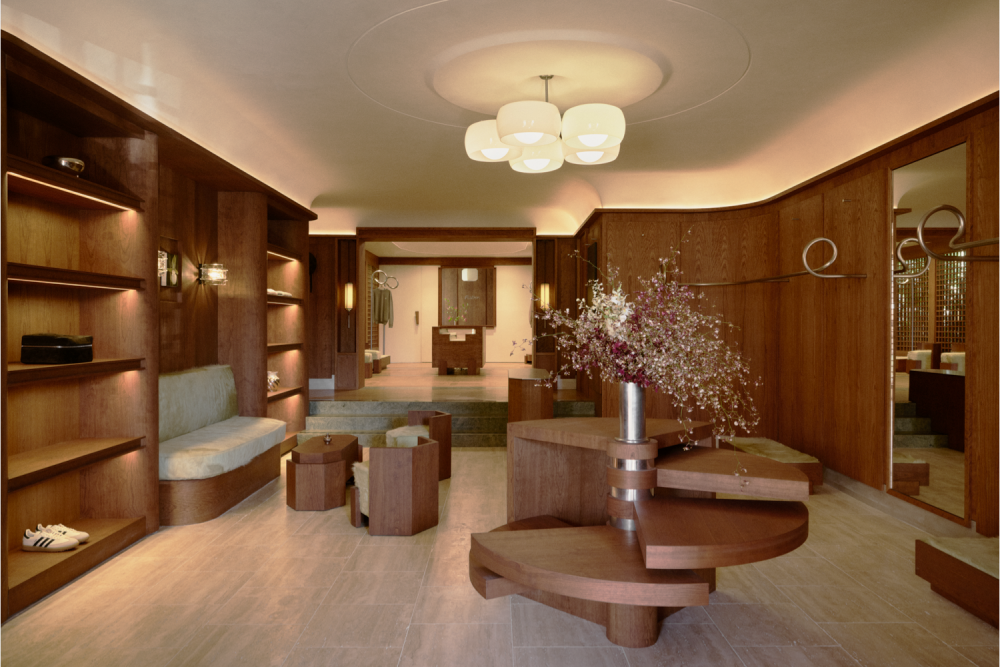 Cult golfwear brand Malbon first opened a store in Los Angeles little over two years ago, and now, it has upped the ante with a second outpost, also on Melrose Place. Situated across the street, the store occupies a low-rise 1954 structure and measures 167 sqm. (1,800 sq.ft.). The interior design sees a renewed collaboration with local architecture and design studio 22RE, and reinterprets elements of Hollywood Regency and Art Deco in an understated fashion. Captured by warm cherry wood panelling and fixtures, and paired with an elegant all-white ceiling, the Malbon store features three distinct spatial zones that comes with a gentle three-step rise and integrated ramp. Shoppers enter the premises in a living room space, the very heart of the store, featuring custom-made open shoe displays and bespoke metal clothing racks with spiral detailing that nod to the motion of a golf ball in play.