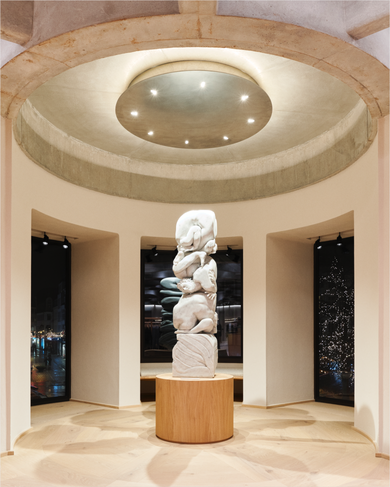 Given its historic importance, the ornate façade has been retained, while during a lengthy and elaborate redevelopment, a bold new concrete framework has been added by Danish practice DesignGroup Architects. The interior design, however, has been created by local design practice damgoodpeople, and seamlessly adapts to this austere backdrop. The BESTSELLER store occupies the building’s ground floor and mezzanine level, while the upper floors are designated as office space. Inspired by the architectural lines, the store’s circular configuration is organised around a large concrete column, and this is also reflected in the curves and shapes of the custom furniture. Positioned along the outermost circular axis, a counter is anchored by two solid walls, carefully wrapped in marble tiles. In collaboration with Italian brand Vaselli, the tiles come in a Sfumato pattern.