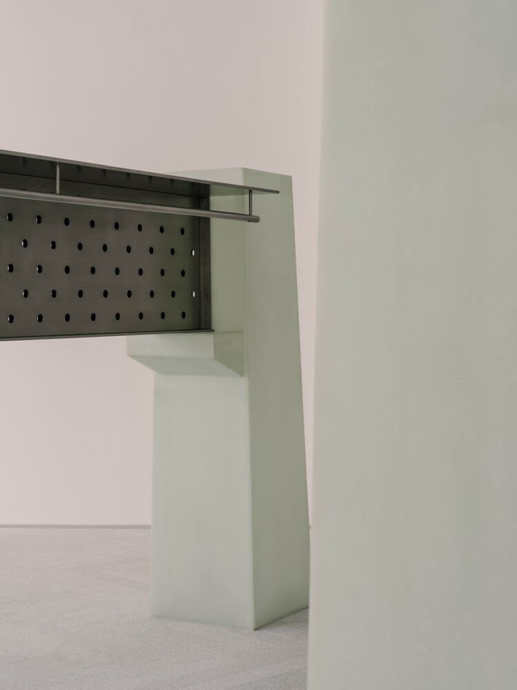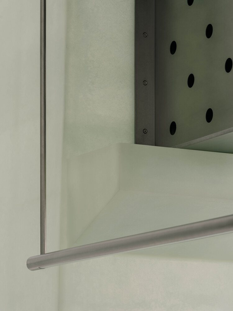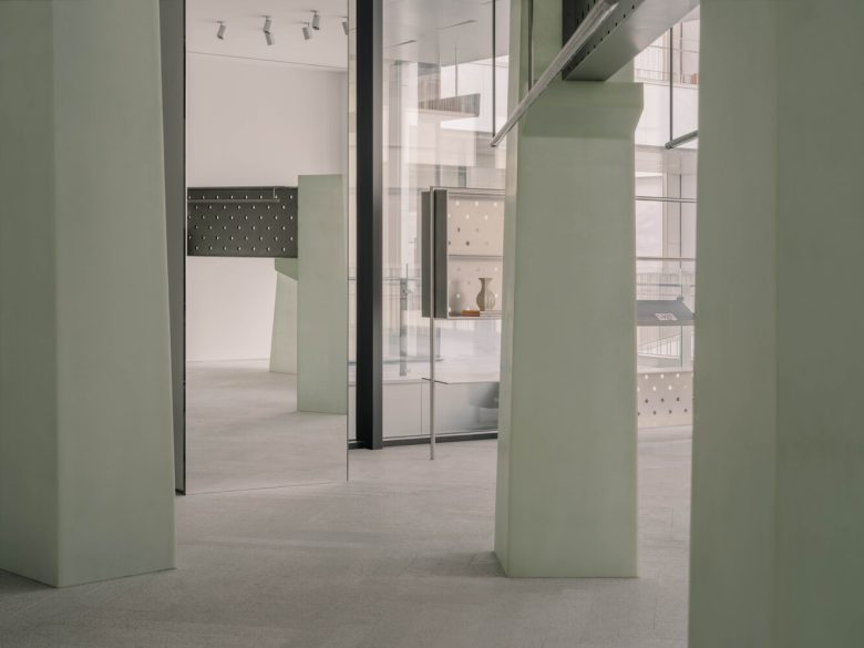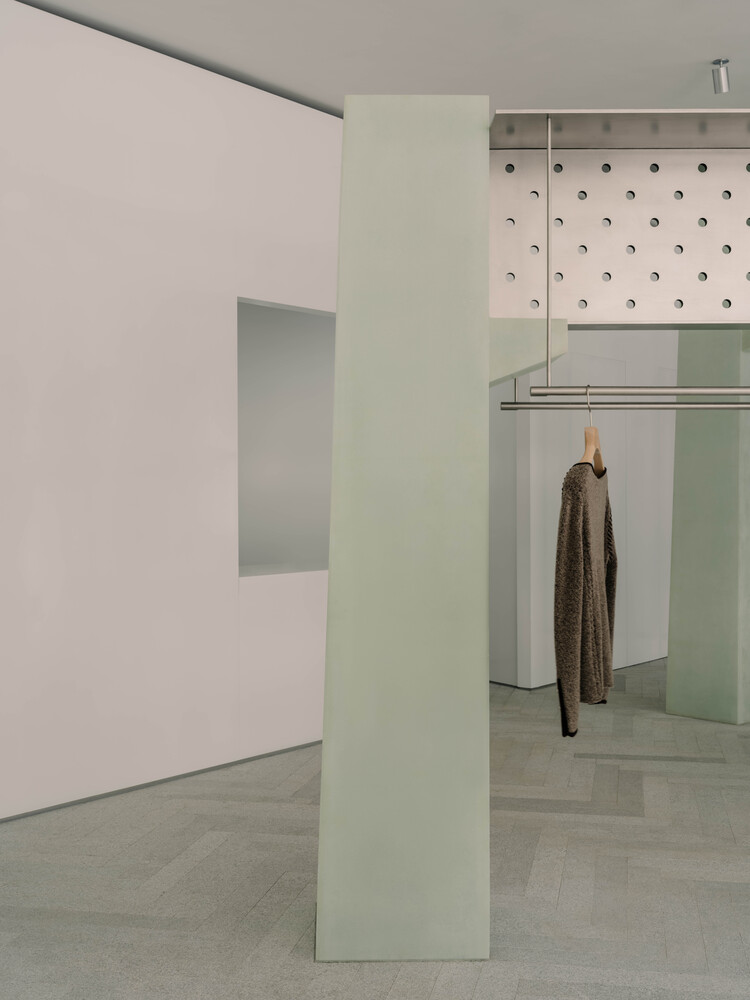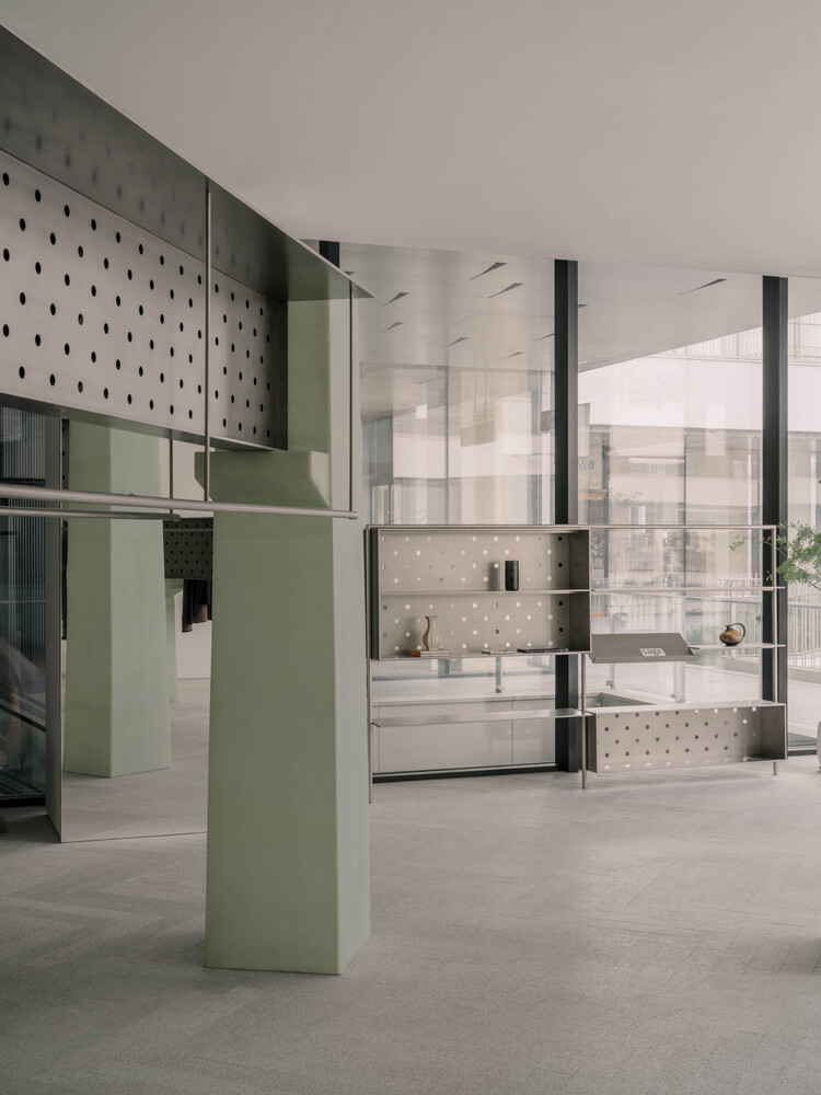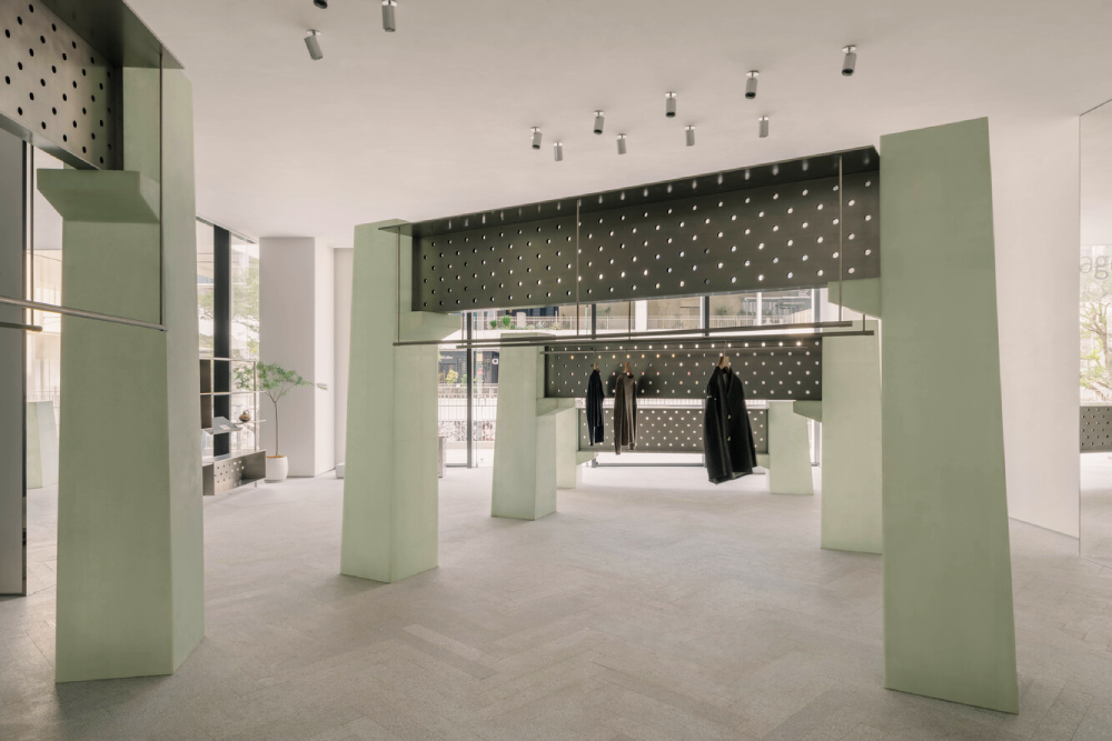 The vertical fiberglass volume resembles simplified corbel columns, fabricated as monolithic pieces in which the internal supporting structure is concealed, revealing smooth surfaces. The perforated metal panels act as corbel beams, eliminating the sense of dullness, allowing light and sightlines to pass through the space. The two components are deliberately joined by exposed bolts, revealing the act of construction. This reciprocation between ‘refined enclosure’ and ‘exposed strength’ derived from structure identified the brand’s aesthetic and contemporary femininity.