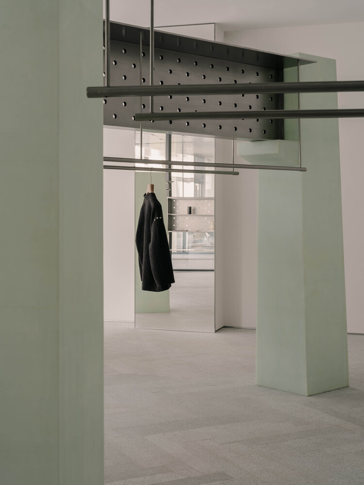 The transparent glass façade diffused the boundary between interior and exterior, transforming the space into a visible ‘Display ‘ on the city scale. Granite flooring extends seamlessly from inside to outside, providing a smooth transition between indoor and outdoor spaces. The interior is divided into two zones: the front zone, which serves as an open ‘Urban Dock’ dedicated to garment display and experience, and the rear zone. The rear zone serves as a functional ‘Support Hull’. The programs like fitting rooms, checkout counter and storage are incorporated into a white wall, while the wall delineates the front and rear zones.