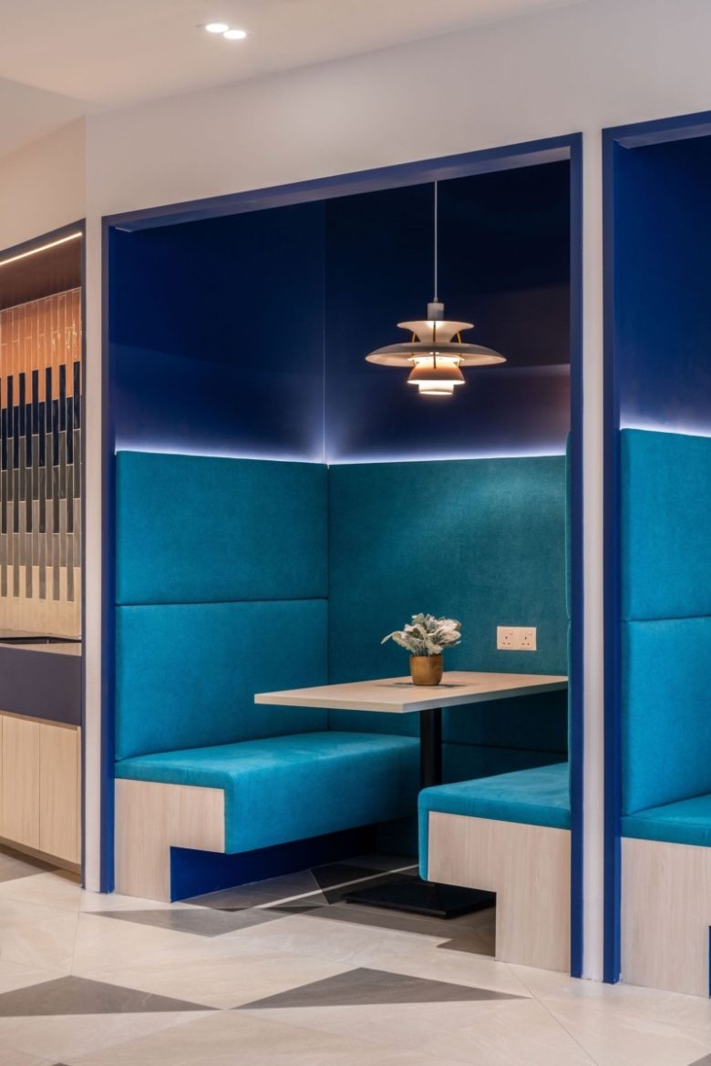 Oppstar’s corporate identity in blue and Vivid Cerulean takes centre stage, subtly enhanced by harmonious hues that bring vibrancy to the space. The pops of colour paired with strategic lighting not only breaks up the monotony but also energises the space. The pantry and Chill Zone area are designed as a refreshing retreat for employees to take their breaks and meals or to simply step away from their work desks. This area features a pantry island, vibrantly coloured booths, and café seating area. For a workforce that primarily operate on computers, the bar seating provides an opportunity for them to rest their eyes from prolonged screen exposure, with a panoramic view of the vast city skyline and outdoor greenery.