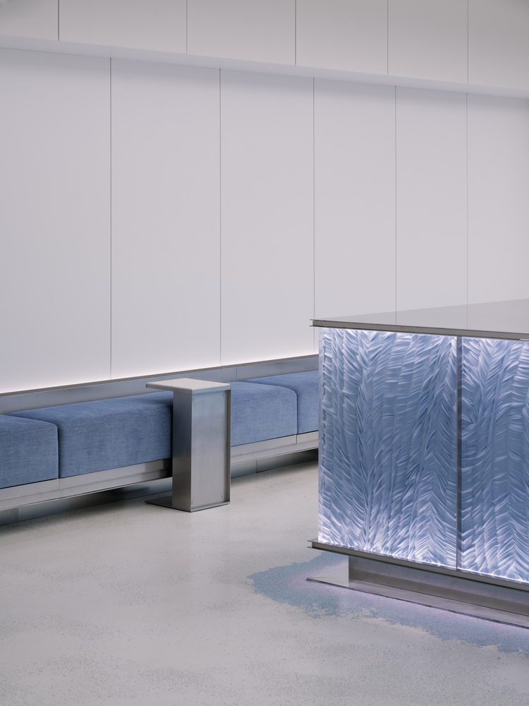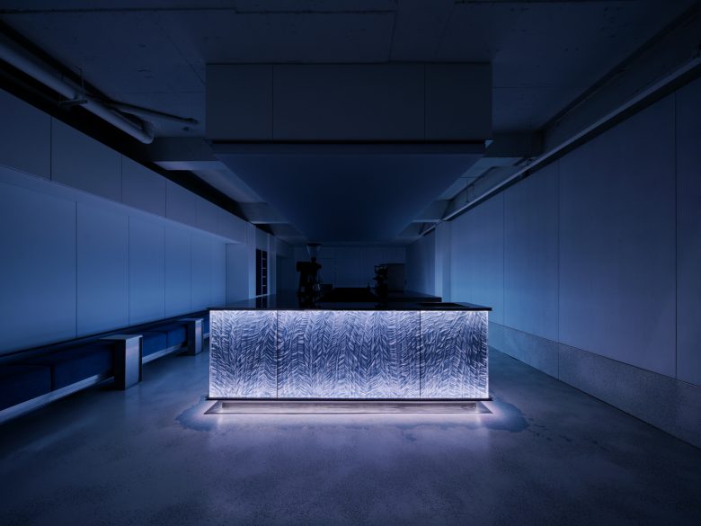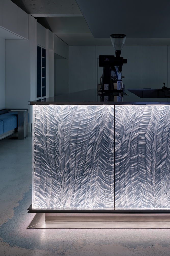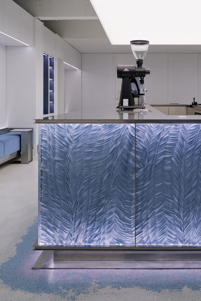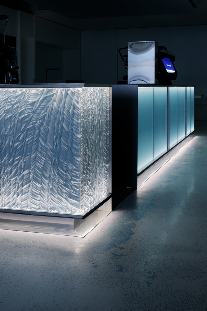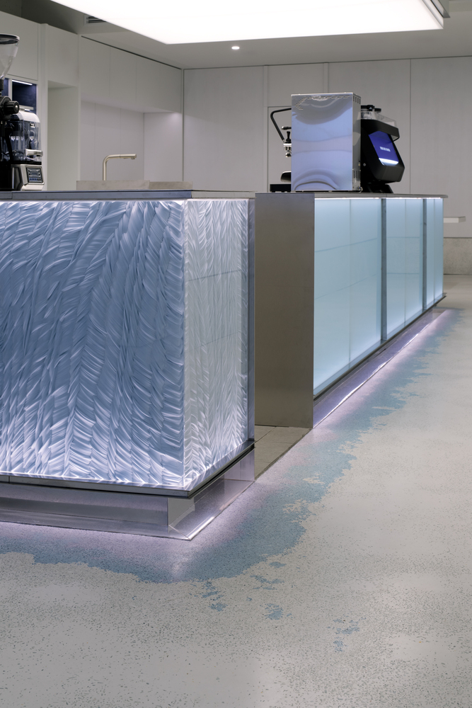 Second, the gentle light cascading from the Barrisol extends onto the front and side panels of the main bar. Crafted by pairing acrylic with Jesmonite, the front surface suggests the luminous surface of the sea holding light, while the addition of satin acrylic introduces both depth and a nuanced vibrancy to the space. Metal finishes are applied to areas other than the acrylic, emphasizing the barista’s sense of professionalism and reinforcing the main bar’s solid, grounded presence.