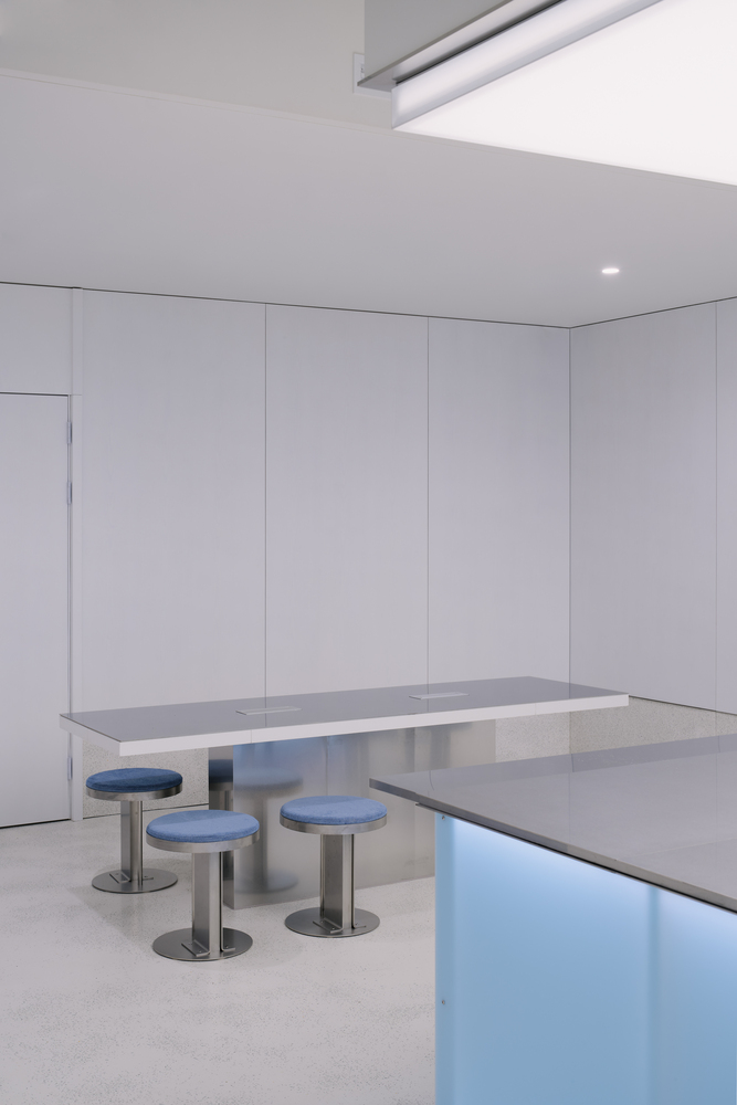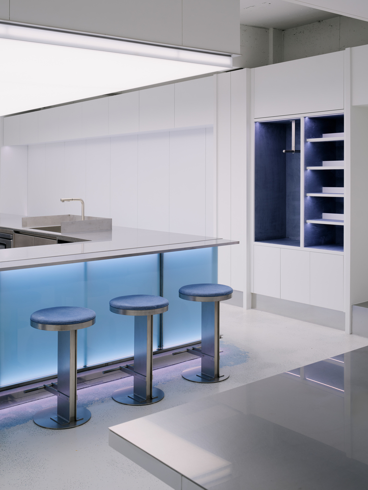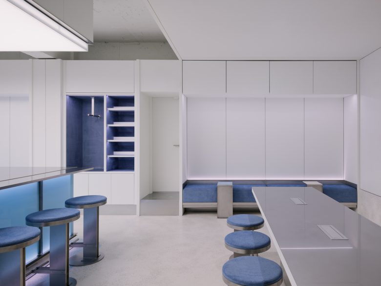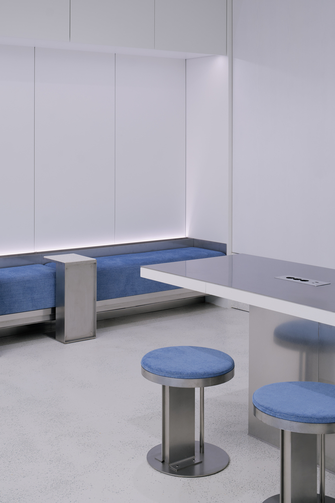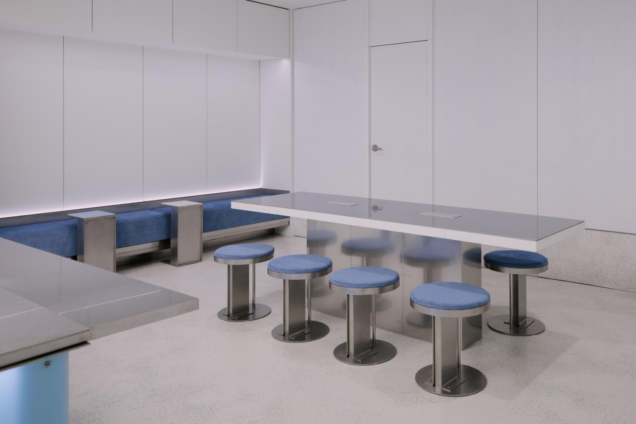 Second, the gentle light cascading from the Barrisol extends onto the front and side panels of the main bar. Crafted by pairing acrylic with Jesmonite, the front surface suggests the luminous surface of the sea holding light, while the addition of satin acrylic introduces both depth and a nuanced vibrancy to the space. Metal finishes are applied to areas other than the acrylic, emphasizing the barista’s sense of professionalism and reinforcing the main bar’s solid, grounded presence.