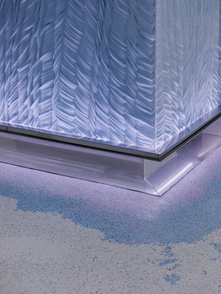 Fourth, the warmth formed within the space finds its way to the epoxy terrazzo floor, where it is held inside the fluorescent chips embedded in the surface. Long after the crowds have gone, the space continues to hold light because that warmth has sunk beneath the floor, allowing it to exhale a gentle warmth even in its most silent hours.