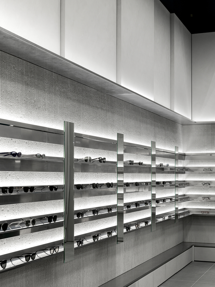 If the central display furniture conveys the spatial identity in a sculptural manner, the wall surfaces express the layered quality of fog through minimal forms and subtle detailing. Instead of spotlighting products directly, the lighting softly illuminates between shelves and walls, shaping the hazy atmosphere of fog. Strategically placed mirrors naturally divide the space into sections for brand display, while differentiated shelving details allow customers to browse comfortably.