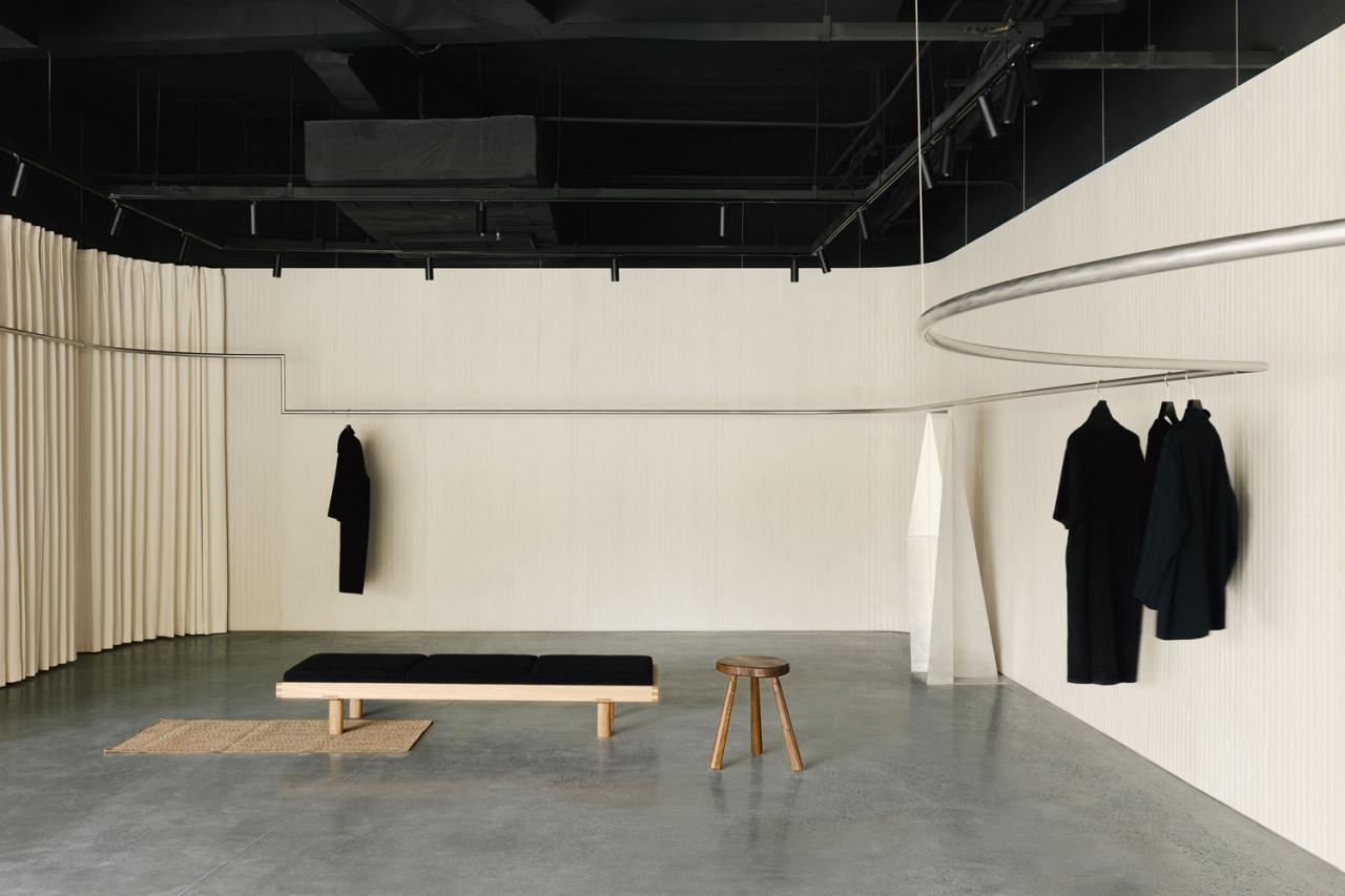Confronted with an irregular original site, SHISUO returned to the fundamental element of fashion display: the hanging rail. A “single continuous rail” is allowed to morph in response to the existing walls, columns, and rainwater pipes. It traces the walls, bends to evade columns, and rises to allow passage, absorbing the chaotic nature of the environment and transforming it into a dynamic vitality.