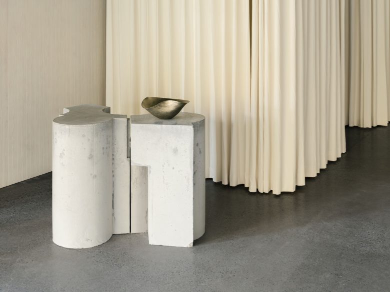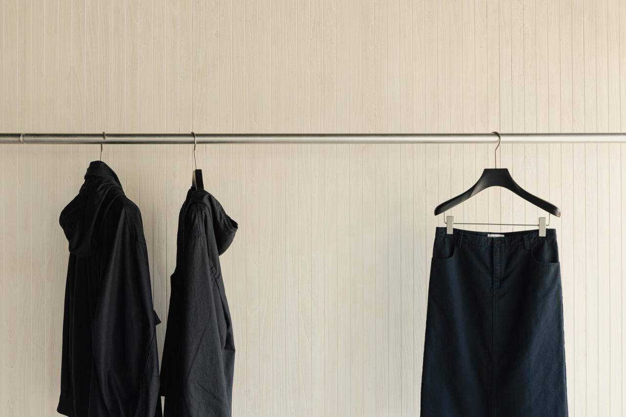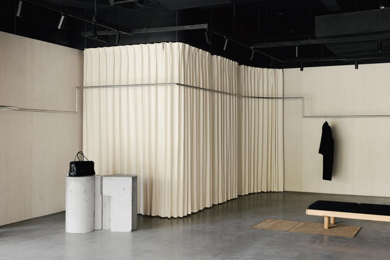 Hand-dyed timber slats recede into the background, imbuing the showroom with a gallery-like simplicity and emotional warmth, providing the ideal backdrop for the garments. When delicate fabrics are introduced, a silent dialogue emerges between hardness and softness, weight and lightness, the rock-like stands and the flowing textiles.