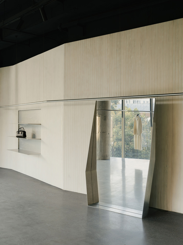 Scattered throughout the space are several full-height mirrors made of stainless steel. Their surfaces are not singular reflective planes but are deconstructed into a series of staggered geometric facets. These forms resemble the solidified afterimages of a body in motion. They serve as an abstract expression of human dynamics and a metaphor for the fluid beauty of clothing in movement—suggesting that fashion is not merely a static display, but art walking through time.