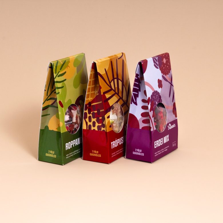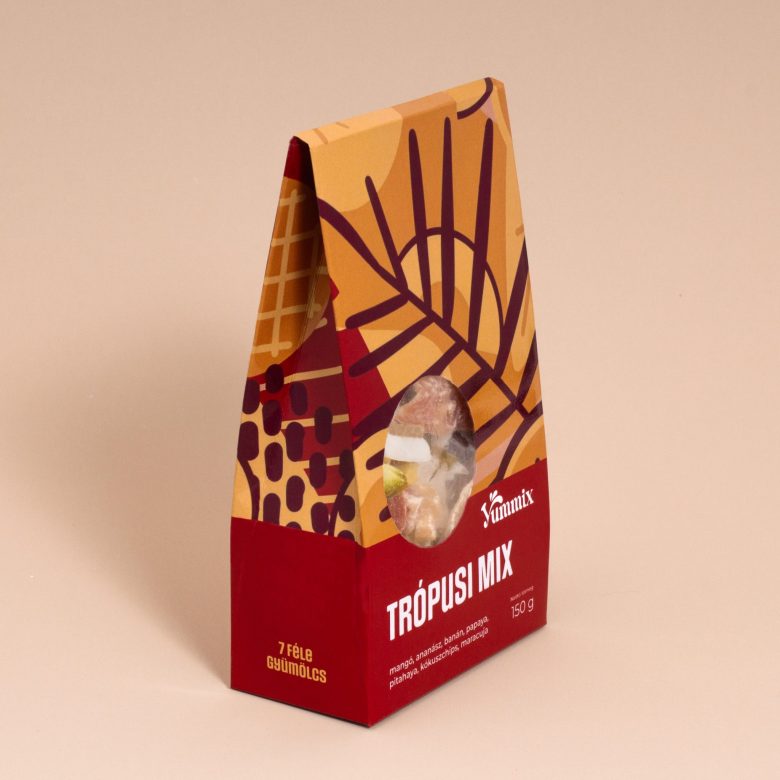 The Yummix packaging is based on a rectangular shape that tapers toward the top. The box is sealed with a semi-circular element, evoking the image of a sliced piece of fruit. For easier transport and storage, the box can be folded flat. The packaging was created in three flavor combinations, each distinguished by a unique yet harmonizing color palette. The graphics feature the fruits found in the mix, as well as plant elements typical of their natural environment. Additionally, a small window allows a peek at the product inside the packaging.