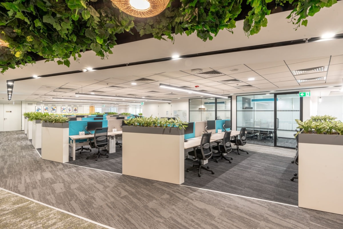 A defining feature of the project is its biophilic design approach, which brings nature into the workplace in meaningful ways. Living planter boxes, suspended greenery, and green feature walls are integrated across reception areas, work zones, and social spaces. These natural elements soften the interiors while enhancing air quality, reducing stress, and fostering a sense of calm and focus. The presence of greenery, paired with warm materials and clean architectural lines, creates a balanced environment that supports both productivity and well-being.