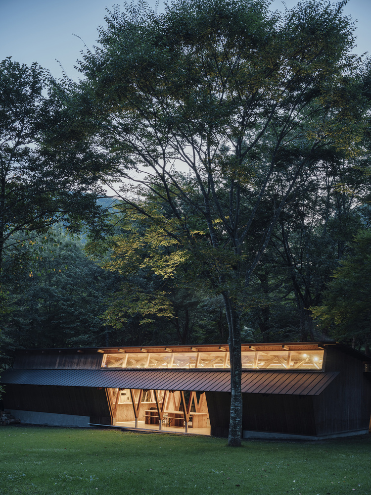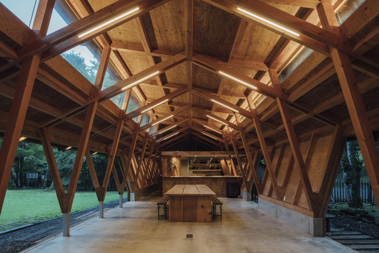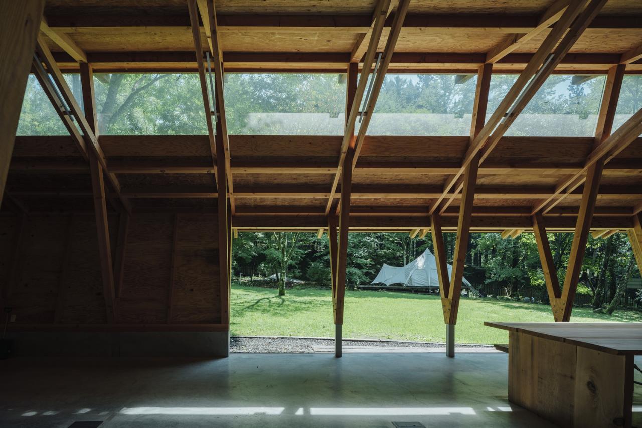 This building represents the final phase of that long-term process. It functions as a lounge where visitors gather, while also serving as a dog training space during rainy weather. When the doors on both sides are fully opened, views extend through the building toward the surrounding forest. Soft daylight filters in from high clerestory windows set between the three overlapping roof planes. The space maintains an intimate relationship with the forest while embodying a sense of transparency rooted in Japanese architectural sensibility. The project aims to create architecture that is gently attuned to its environment and allows occupants to experience nature itself.