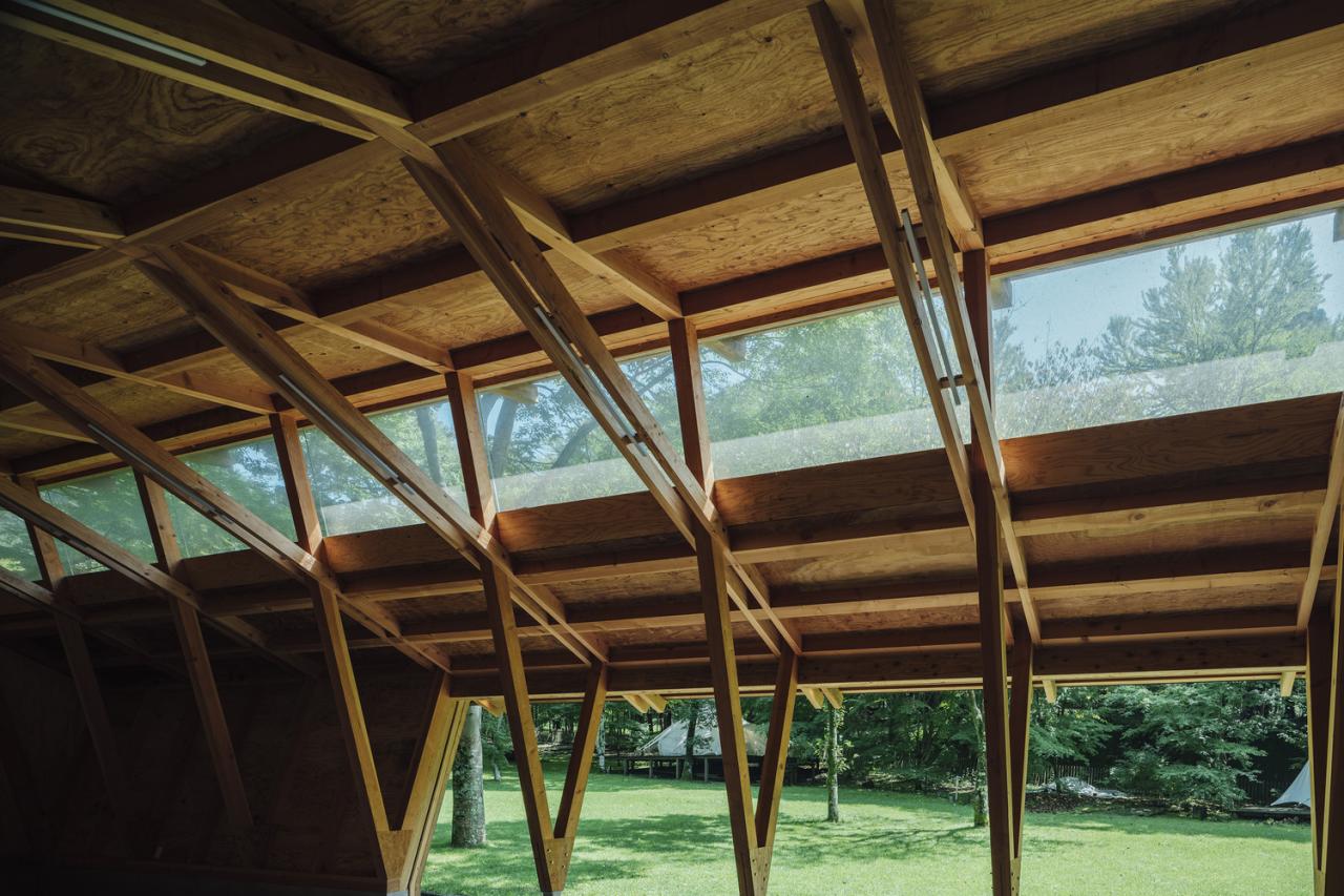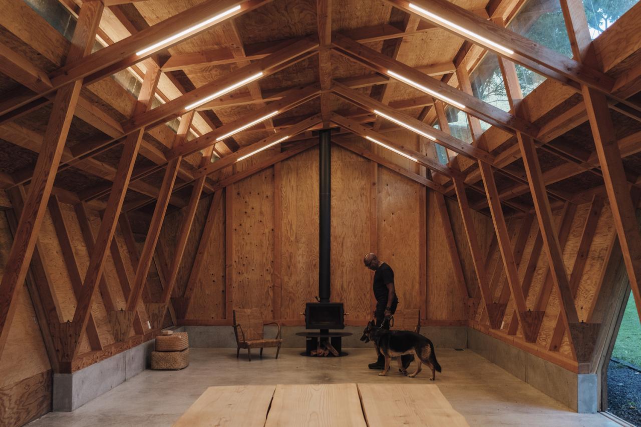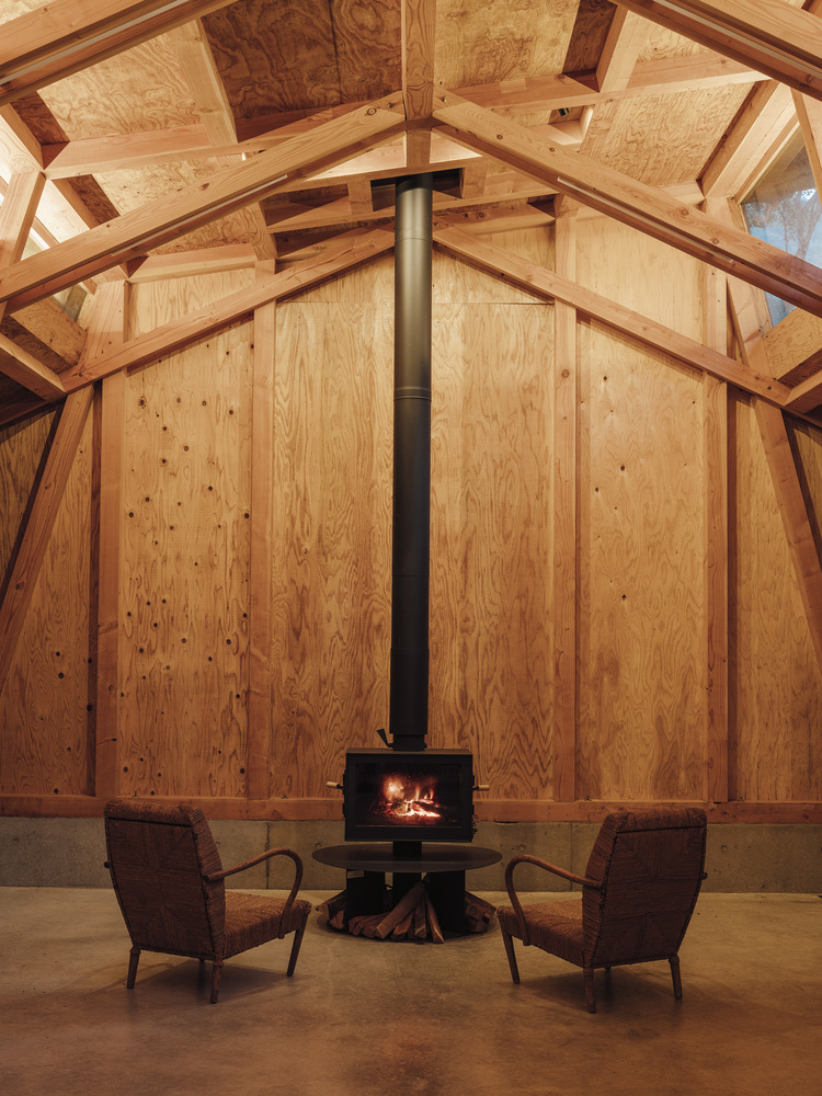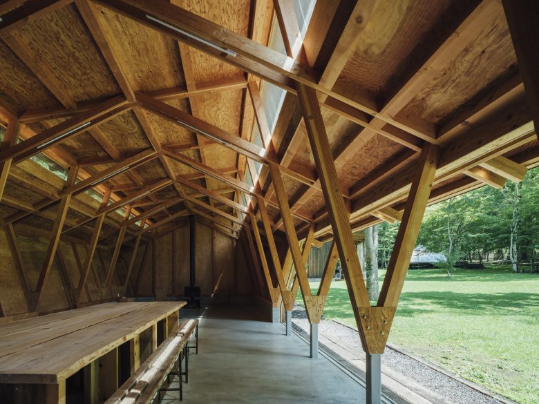 This building represents the final phase of that long-term process. It functions as a lounge where visitors gather, while also serving as a dog training space during rainy weather. When the doors on both sides are fully opened, views extend through the building toward the surrounding forest. Soft daylight filters in from high clerestory windows set between the three overlapping roof planes. The space maintains an intimate relationship with the forest while embodying a sense of transparency rooted in Japanese architectural sensibility. The project aims to create architecture that is gently attuned to its environment and allows occupants to experience nature itself.