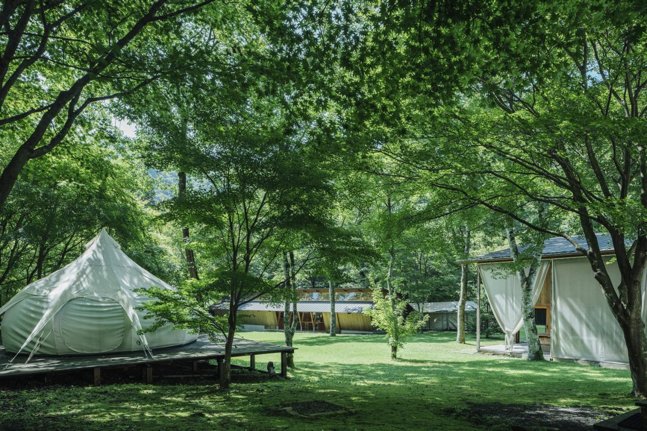 The site contains various elements scattered throughout the landscape, including tents where guests can stay with their dogs, a dog training school, and a grassy dog run. The exterior spaces and buildings have been incrementally expanded over time, allowing the project to grow organically through continuous collaboration.