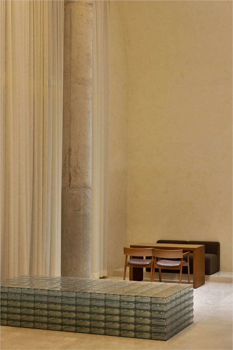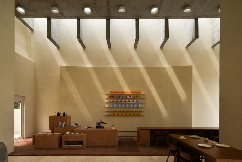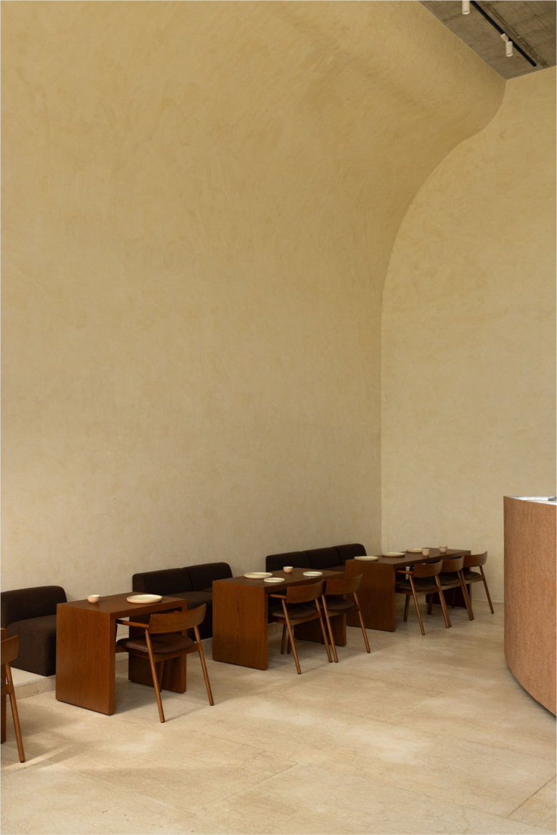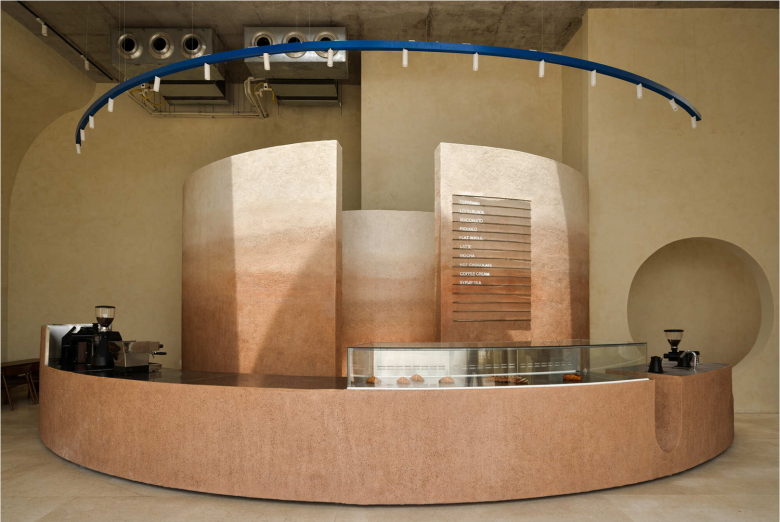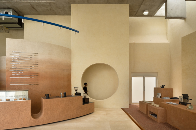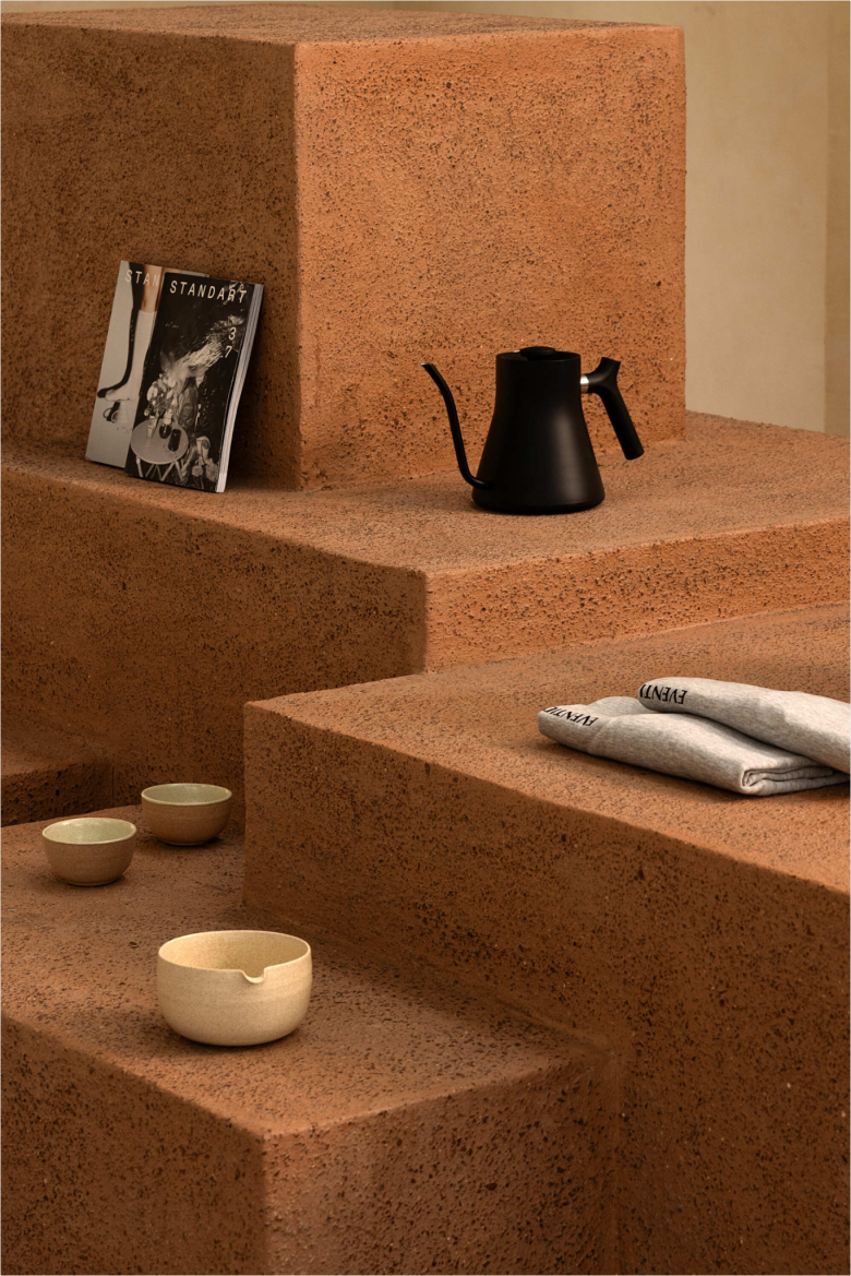 On the side, a tiered satellite display in similarly coloured stucco can be found, laden with branded Eventide merchandise. The back and side walls are dipped in a complementary, muted beach-like shade. The counter is flanked by various seating areas, featuring a variety of furnishings, ranging from upholstered low benches paired with timber tables and chairs, to a large communal co-working table with chairs, and even a table comprising of glass blocks. Concealed behind the aforementioned arched back panels is the entrance to Eventide‘s kitchen, restrooms, utility room, and backyard. The Eventide menu lists a variety of classic coffee concoctions, in addition to syrup tea, matcha and hot chocolate. © superfuture