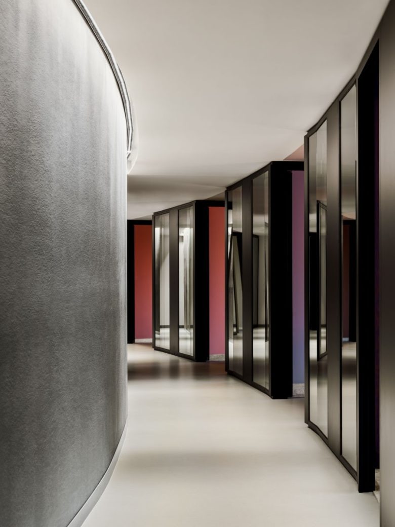 Views across Berlin – from the Tiergarten to the Bundestag – become an integral part of the concept, acting as a daily source of inspiration. Along the gently curved internal corridor, this progression becomes spatially tangible: looking through the glazed office walls, the colour scheme of the individual rooms shifts gradually. Like a walk through the seasons of the neighbouring Tiergarten.