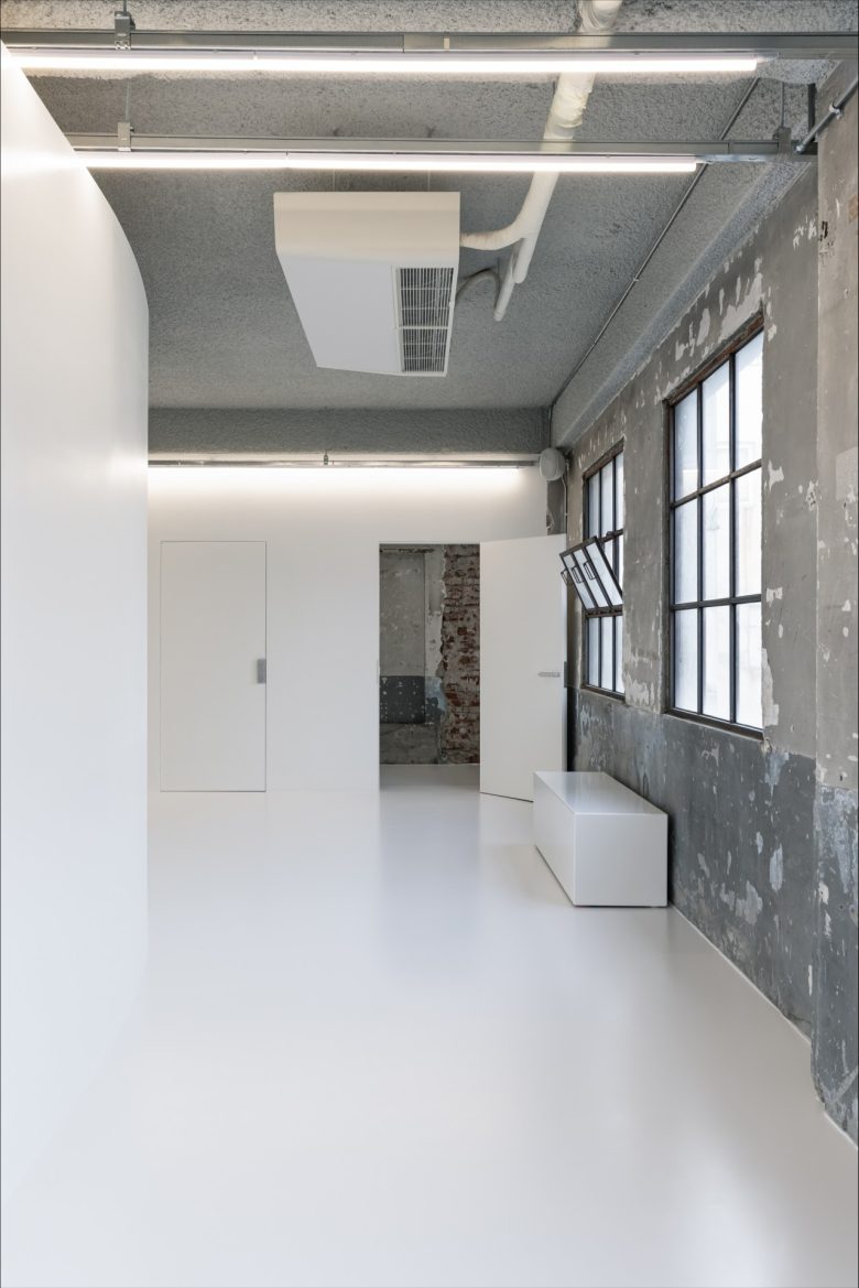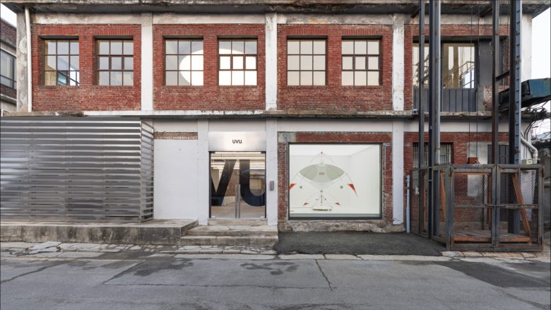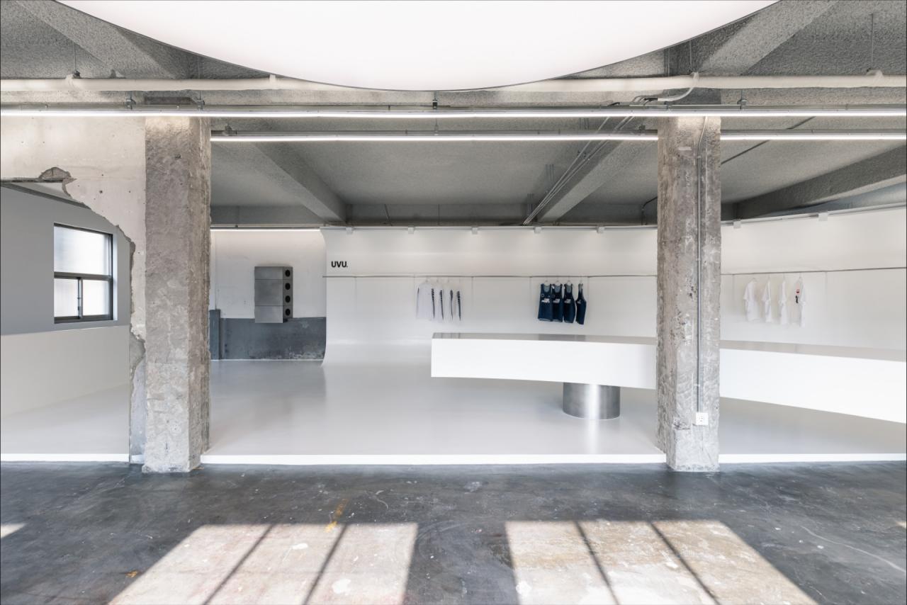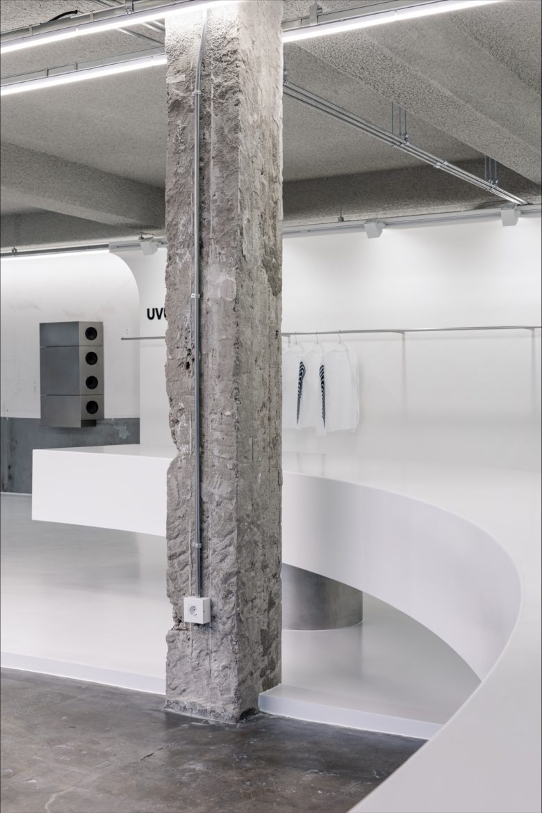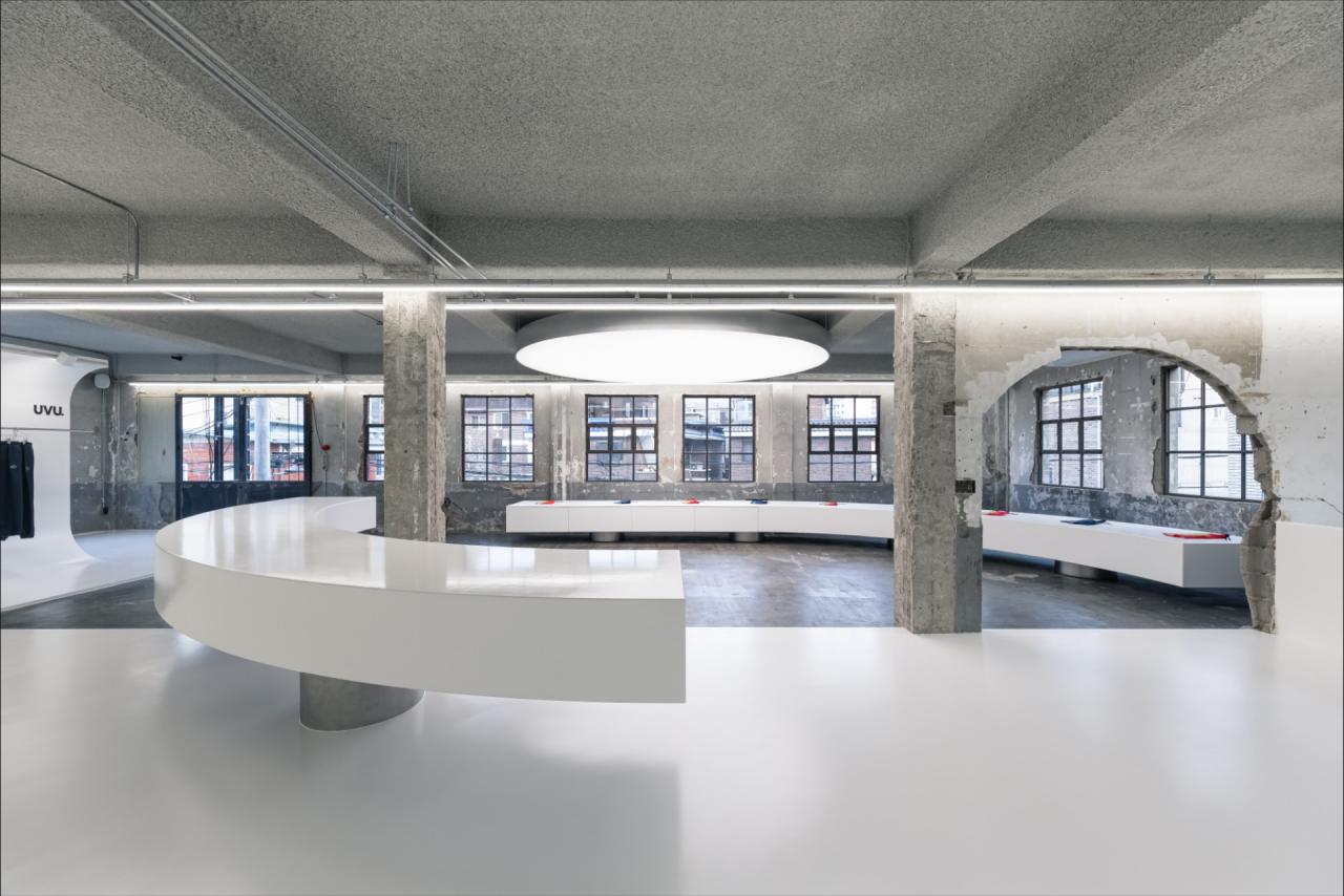 Designed by two-fold, an architecture practice and longtime collaborator based in London, the building’s original concrete-and-brick shell has been largely retained, and is even embedded in the interior design. The façade of the UVU store sees some visible tweaks which hint the sleek modern interventions that can be found indoor. The ground floor, used as a reception and event space, currently ushers shoppers inside with a multimedia installation, while the actual store is situated one floor up. Upon entering, a light-filled open space unfolds, framed by concrete flooring, partially dipped in a matching white hue, and a lightly touched-up concrete ceiling.