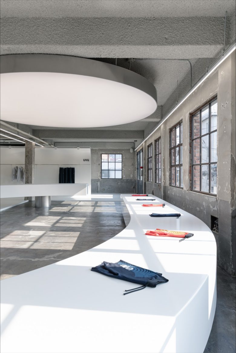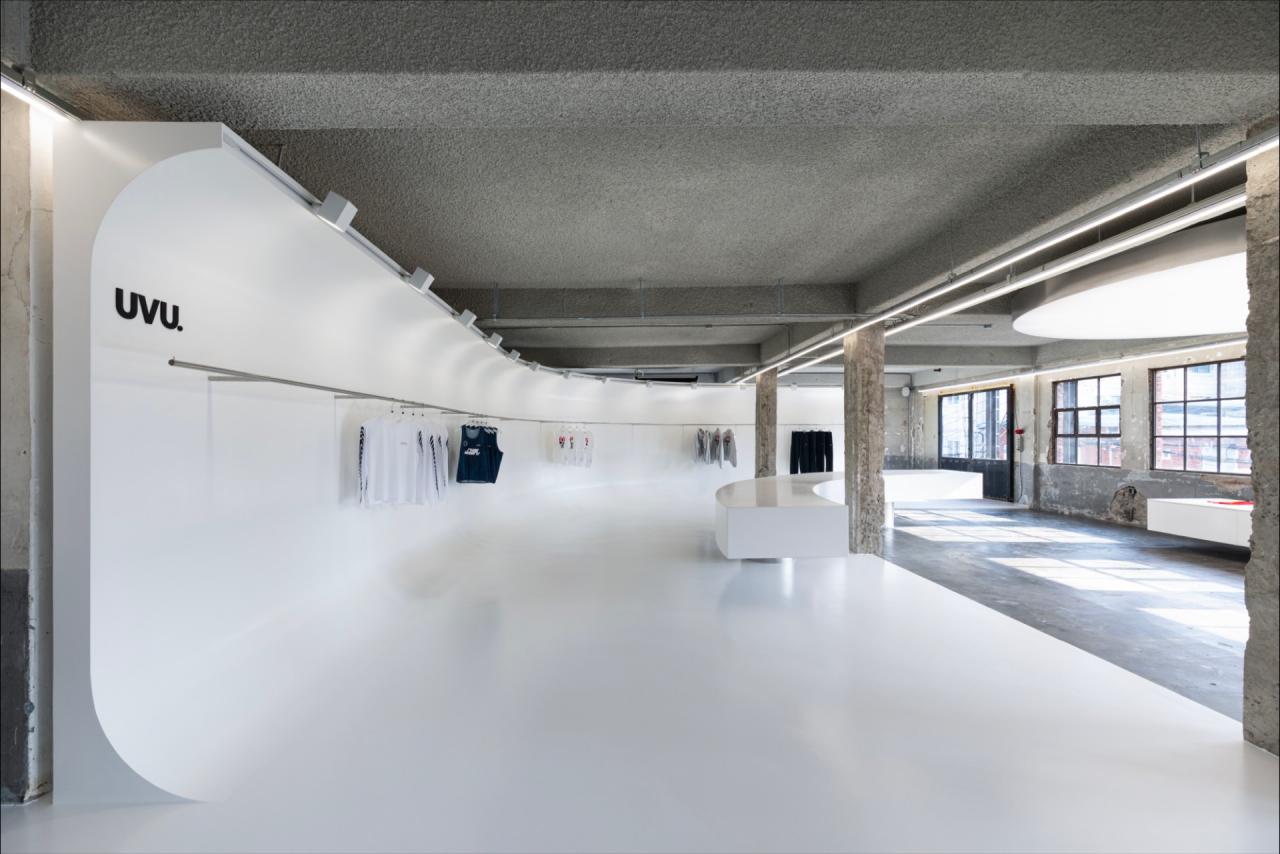 The visual dynamic of the UVU store is anchored by a seemingly inserted curved wall, fitted out with a single rail to display clothing, and straddling almost the entire breadth of the space. A robust elongated display aligns with the aforementioned volume, while another similar display is positioned perpendicular and lining the façade. Lighting is functional, and further accentuates the minimalist design codes, comprising merely light spots attached to the curved wall, sleek linear light fixtures lining the façade, back wall, and central row of bare concrete support pillars, and last but not least, a large-sized circular ceiling light. The new UVU store stocks the full range of performance apparel pieces and accessories, in addition to a special capsule collection created for the store launch. © superfuture