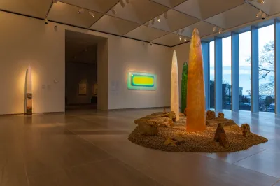 The sculptures may look machine-made, but they are not. Each piece is cast and layered by hand, with pigments tied to specific places. At the Bruce, several monoliths reference Puerto Rican sites—river systems, caves, coastal formations—while the stones arranged around them come from the California desert near Colón’s studio, creating a small landscape inside the gallery.