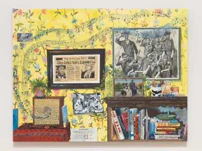 Another work from this era, Veterans Day (2016), features a flow of musical notes that surround a framed newspaper article about the conviction of Muhammad Ali for refusing to fight in the American war in Vietnam and an old photograph of soldiers raising their fists. “One of the things that’s happening in my work is like a sympathy for, not in a pitiful way, but sort of sympathy for humanity,” Dupuy-Spencer told the Whitney Museum when that painting appeared in the 2017 Whitney Biennial.