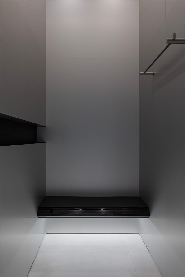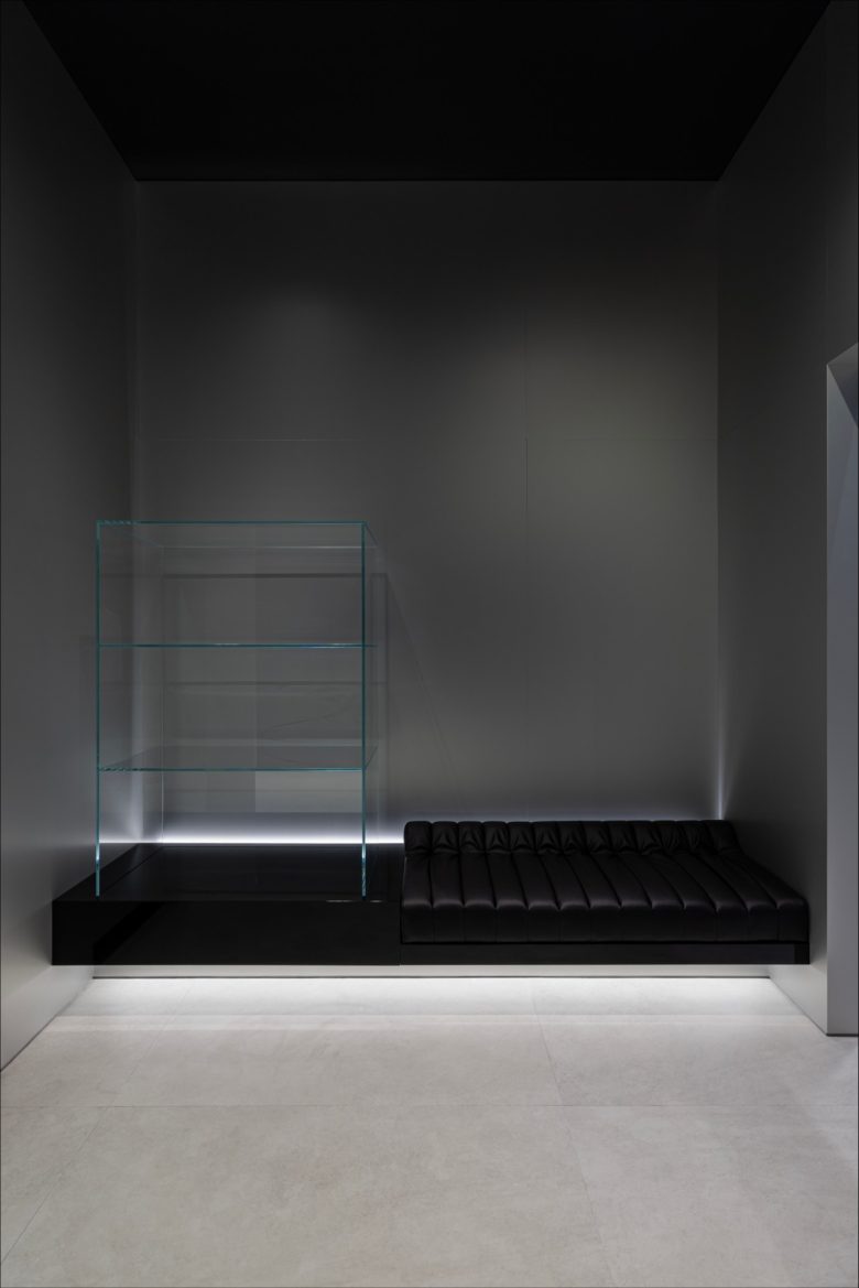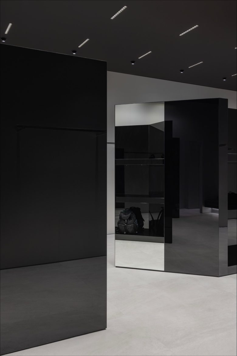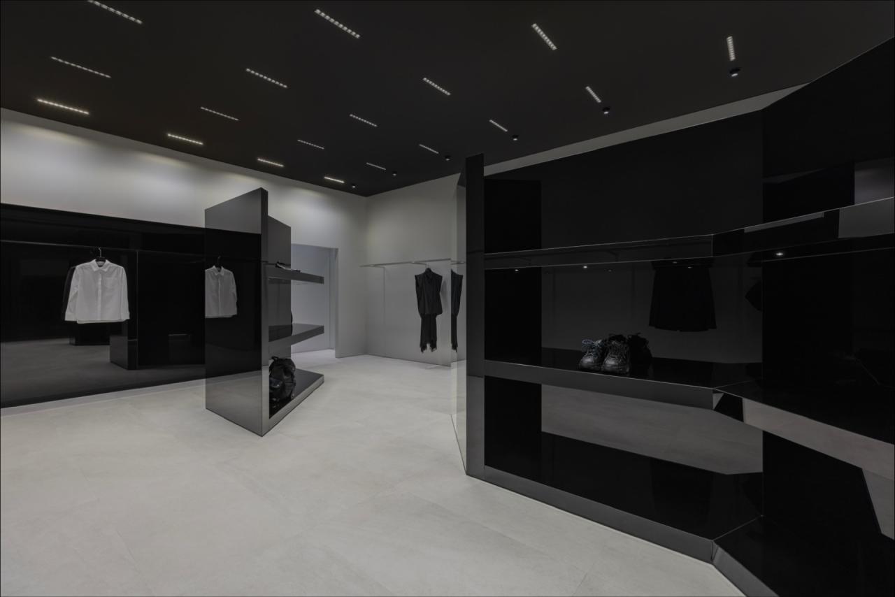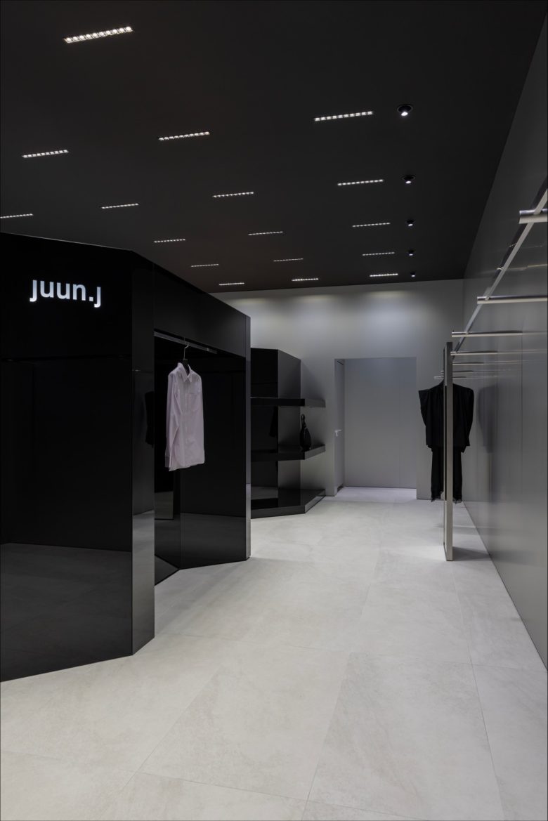 A large media screen, attached to the volume, visually takes centre stage, beckoning shoppers from afar with branded footage. The sleek black volume, which has a glossy black finish, meanders through the entire space, naturally guiding shoppers to segments of the merchandise on display. The structure is off-set by a backdrop of matte metallic walls, featuring a single metal display rail. Additionally, evenly diffused lighting eliminates emotional excess, reducing the space to a neutral space that highlights the sculptural qualities of the garments themselves. At the back of the store, both a seating nook with a tiered glass display, and a fitting room can be found. The new juun.j shop-in-shop stocks a selection of men’s and women’s apparel. © superfuture