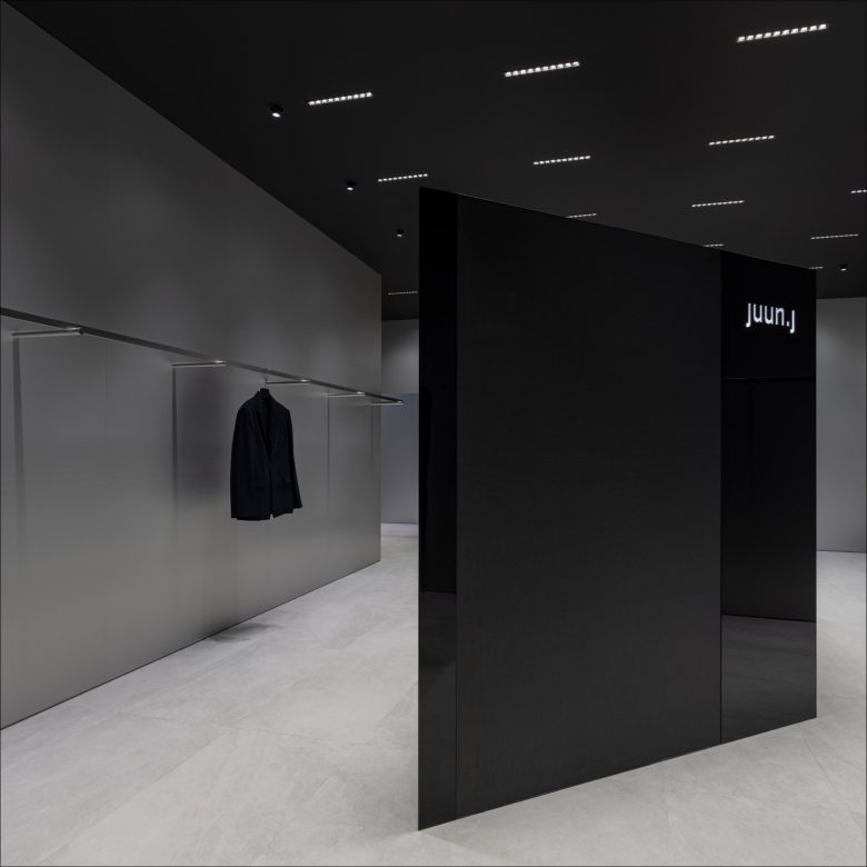 It’s not only the silhouettes of South Korean fashion designer Wook-jun Jung that make heads turn. Similarly avant-garde, Jung has turned the retail spaces of his rising label juun.j into striking understated stages for his designs. Well-rooted in the homeland, juun.j has a sizeable retail network, including a flagship store in Seoul, which we covered in a previous post, and a growing number of shop-in-shops at leading department stores. A little while ago, the brand inaugurated a new shop-in-shop at The Hyundai Seoul department store, a favourite shopping destination of the city’s gilded youth. Perched on the second floor, the juun.j shop-in-shop occupies a compact unit, featuring an interior design by local design practice uneg, which is defined by restrained monotone hues and a pared-back volume.