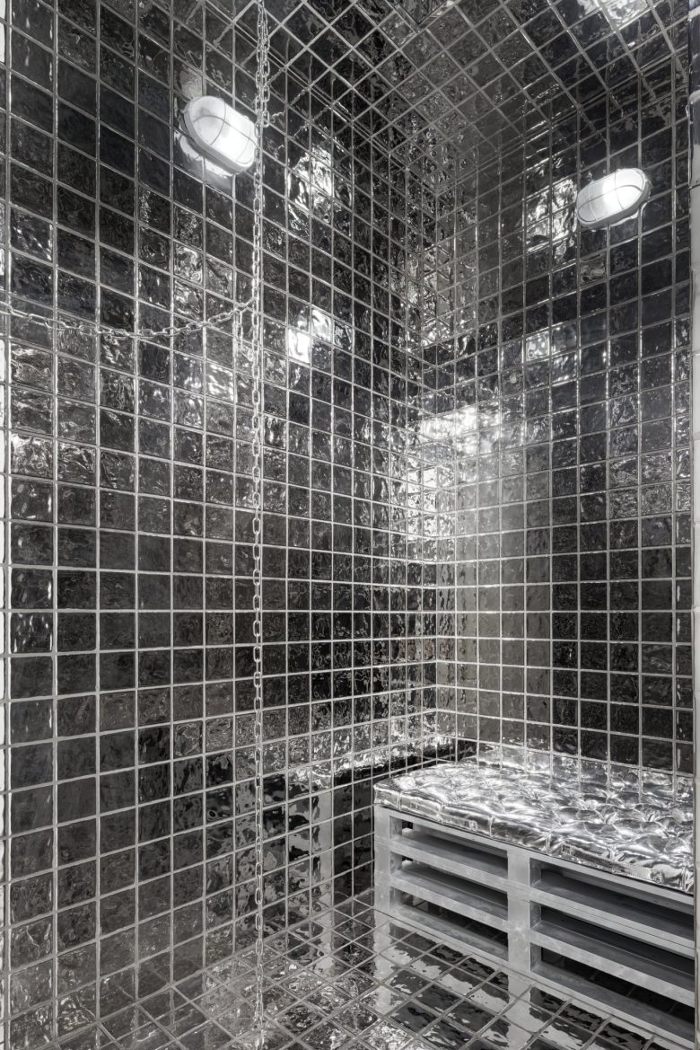 The ceiling showcases an orange breathing light and a fractured soft membrane design, seamlessly blending art and functionality. A curved wall with a cracked mirror and pulsating lights generates dynamic visuals, while fitting rooms with handcuff-shaped handles and silver metal tiles reinforce the rebellious theme. An “Prison Break Exit” featuring an infinity mirror and a ladder motif further amplifies the narrative of freedom.